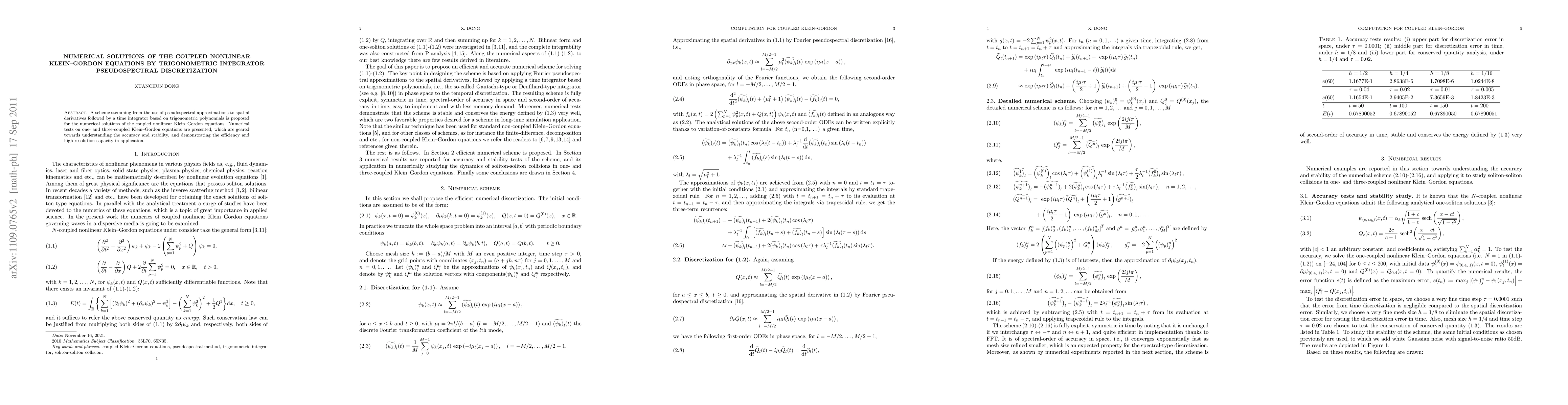 A scheme stemming from the use of pseudospectral approximations to spatial derivatives followed by a time integrator based on trigonometric polynomials is proposed for the numerical solutions of the coupled nonlinear Klein--Gordon equations. Numerical tests on one- and three-coupled Klein--Gordon equations are presented, which are geared towards understanding the accuracy and stability, and demonstrating the efficiency and high resolution capacity in application.