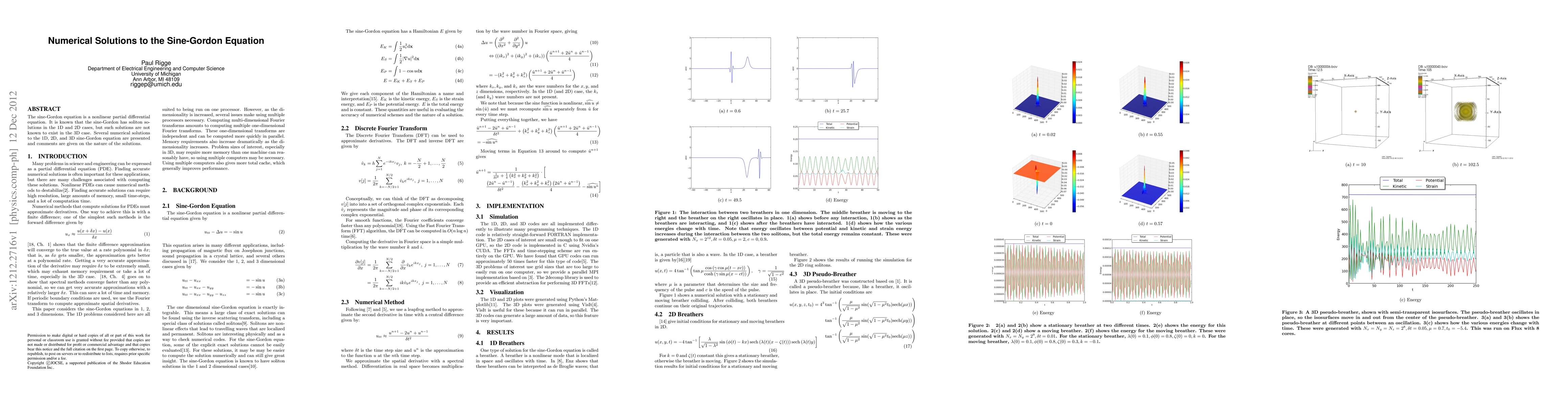 This research presents numerical solutions for the sine-Gordon equation in 1D, 2D, and 3D, highlighting soliton behaviors in lower dimensions while noting a lack of known soliton solutions in the 3D case. The study provides insights into the nature of these solutions across different dimensionalities.
