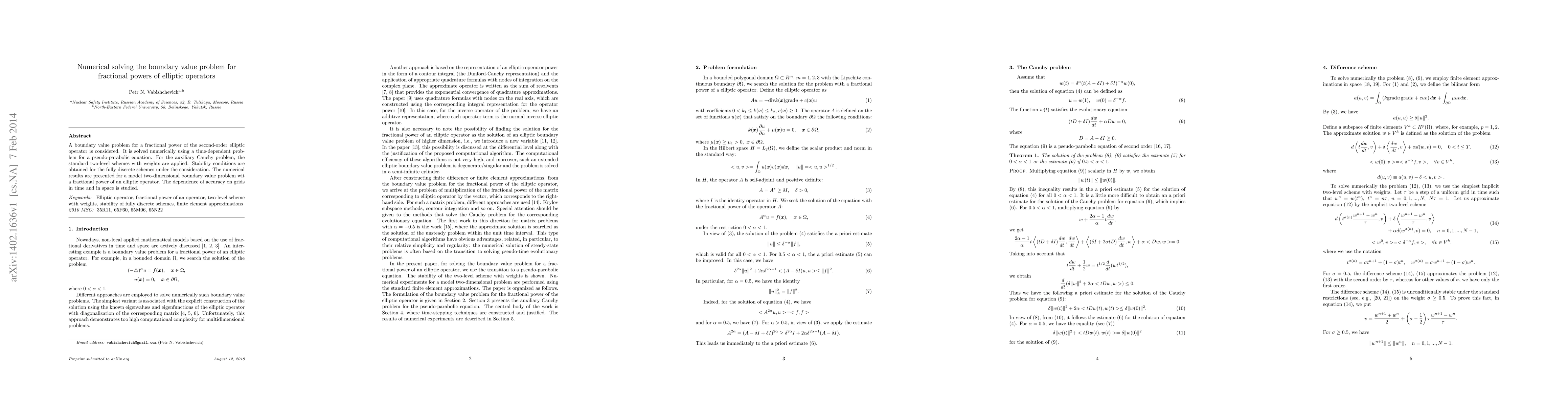 This paper numerically solves a boundary value problem for fractional powers of elliptic operators using a pseudo-parabolic equation approach. Stability conditions for the fully discrete schemes are derived, and accuracy dependence on grid sizes in time and space is analyzed through a two-dimensional model problem.