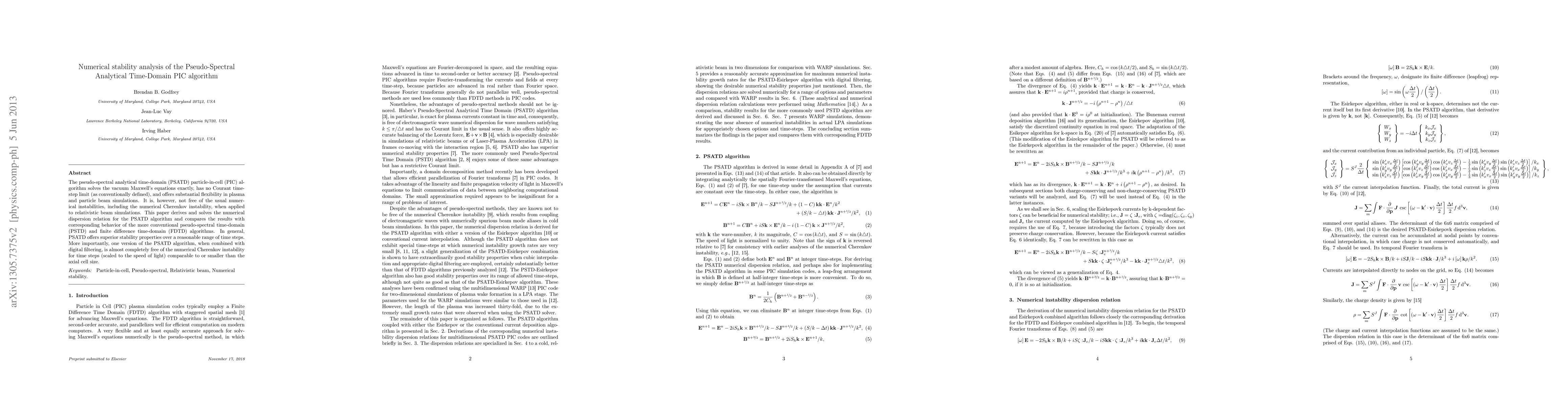 This paper investigates the numerical stability of the Pseudo-Spectral Analytical Time-Domain (PSATD) PIC algorithm, comparing it to the Pseudo-Spectral Time-Domain (PSTD) and Finite Difference Time-Domain (FDTD) algorithms. It finds that PSATD generally offers superior stability, especially when combined with digital filtering to mitigate the numerical Cherenkov instability.