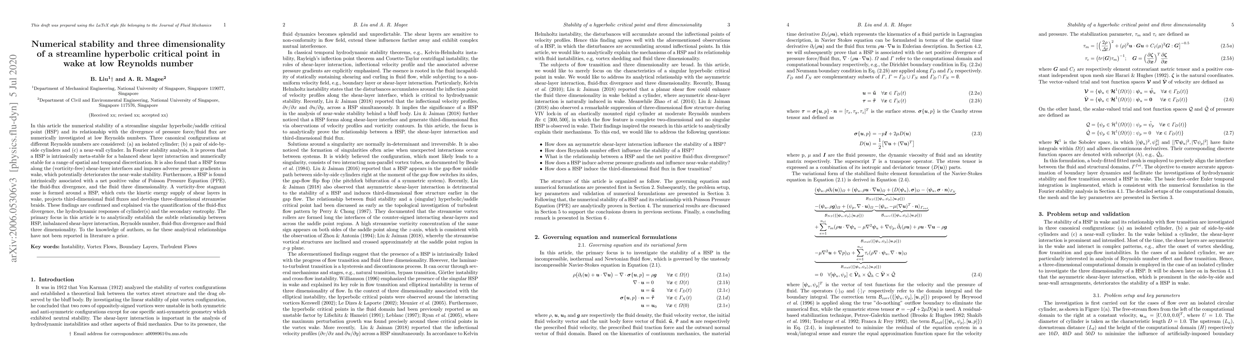 In this work the numerical stability of a streamline singular hyperbolic/saddle critical point (HSP) and its relationship with the divergence of pressure force/fluid flux are numerically investigated at low Reynolds numbers. Three canonical configurations at different Reynolds numbers are considered: (a) an isolated circular cylinder; (b) side-by-side circular cylinders and (c) a near-wall circular cylinder. The objective is to investigate the behavior of a HSP subjecting to imbalanced shear-layer interaction and different Reynolds numbers. It is found that a HSP evolves along the shear-layer interfaces and imposes adverse pressure gradients, which potentially deteriorates near-wake stability. The inherent characteristics of a HSP is linked with net positive fluid-fluid divergence and fluid three dimensionality. A vorticity-free stagnant zone is formed around a HSP, which cut the kinetic energy supply of shear layers in wake, project third-dimensional fluid fluxes and develops three-dimensional streamwise braids. These findings are confirmed and explained via the quantification of the fluid-flux divergence, the hydrodynamic responses of cylinder(s) and the secondary enstrophy. The primary focus in this article is to reveal the subtle analytical relationships between HSP, divergence of pressure force/fluid flux, fluid three dimensionality and imbalanced shear-layer interaction. To the knowledge of authors, so far these analytical relationships have not been reported in literature.