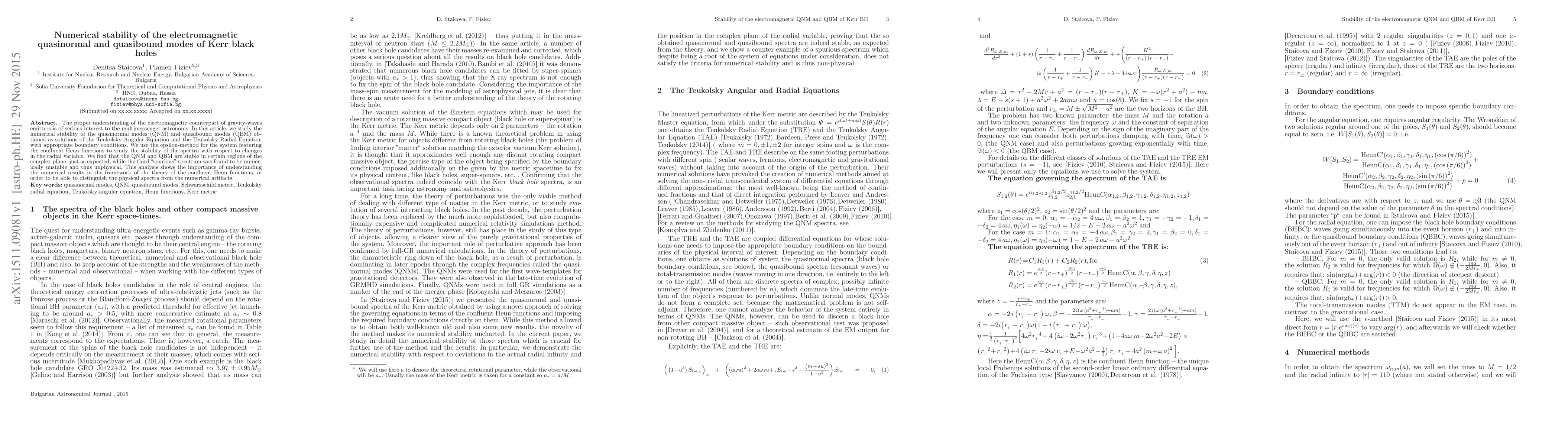 The proper understanding of the electromagnetic counterpart of gravity-waves emitters is of serious interest to the multimessenger astronomy. In this article, we study the numerical stability of the quasinormal modes (QNM) and quasibound modes (QBM) obtained as solutions of the Teukolsky Angular Equation and the Teukolsky Radial Equation with appropriate boundary conditions. We use the epsilon-method for the system featuring the confluent Heun functions to study the stability of the spectra with respect to changes in the radial variable. We find that the QNM and QBM are stable in certain regions of the complex plane, just as expected, while the third "spurious" spectrum was found to be numerically unstable and thus unphysical. This analysis shows the importance of understanding the numerical results in the framework of the theory of the confluent Heun functions, in order to be able to distinguish the physical spectra from the numerical artifacts.