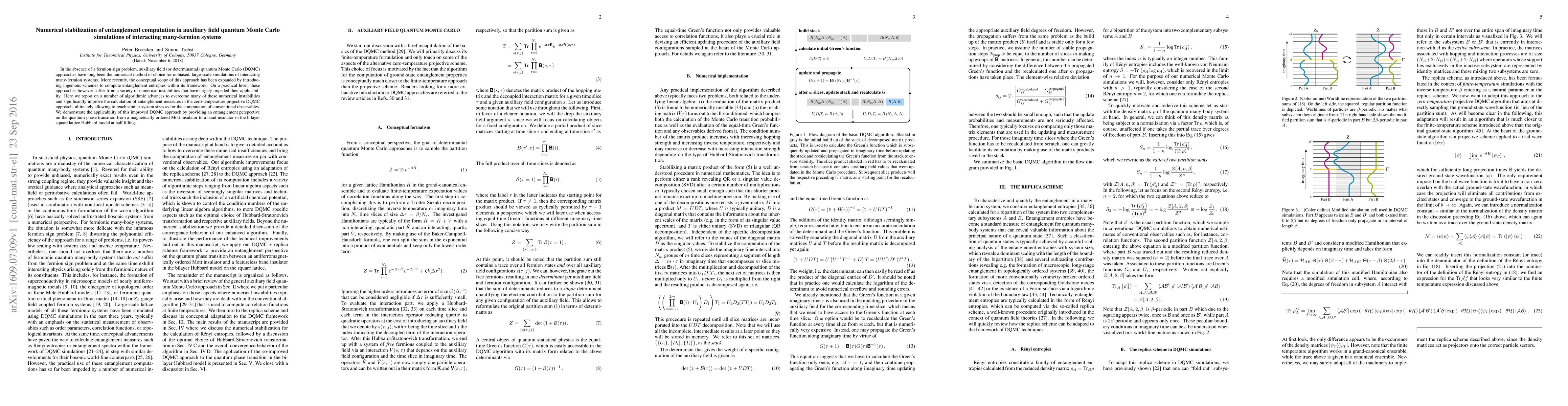 This paper presents algorithmic improvements to stabilize entanglement computation in auxiliary field quantum Monte Carlo simulations for many-fermion systems, addressing numerical instabilities and enabling accurate calculations of entanglement measures. The enhanced method is demonstrated through a study of the quantum phase transition in the bilayer Hubbard model.