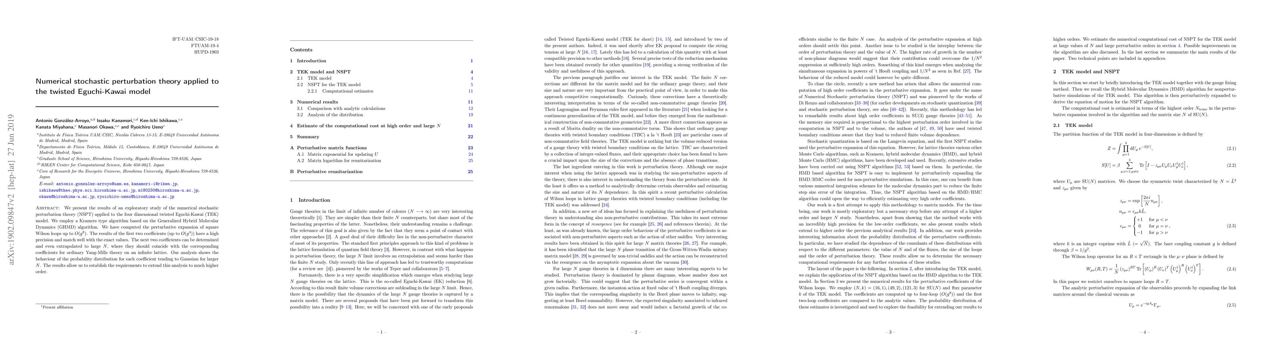 We present the results of an exploratory study of the numerical stochastic perturbation theory (NSPT) applied to the four dimensional twisted Eguchi-Kawai (TEK) model. We employ a Kramers type algorithm based on the Generalized Hybrid Molecular Dynamics (GHMD) algorithm. We have computed the perturbative expansion of square Wilson loops up to $O(g^8)$. The results of the first two coefficients (up to $O(g^4)$) have a high precision and match well with the exact values. The next two coefficients can be determined and even extrapolated to large $N$, where they should coincide with the corresponding coefficients for ordinary Yang-Mills theory on an infinite lattice. Our analysis shows the behaviour of the probability distribution for each coefficient tending to Gaussian for larger $N$. The results allow us to establish the requirements to extend this analysis to much higher order.