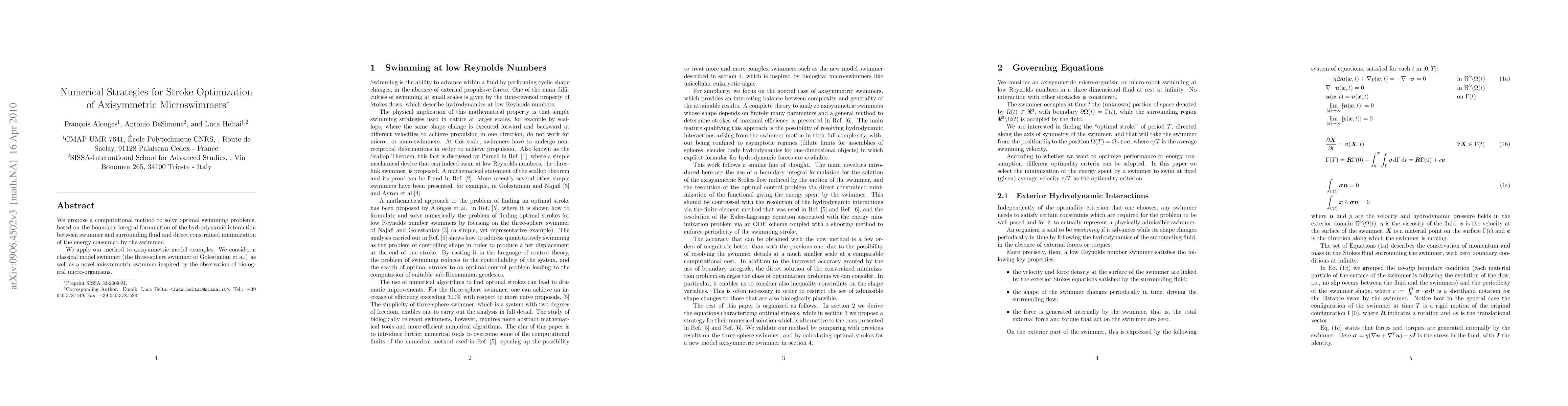 Researchers developed a computational method to optimize the swimming performance of microswimmers, using boundary integral formulation and direct constrained minimization to reduce energy consumption. The approach was applied to axisymmetric models, including a novel design inspired by biological organisms.