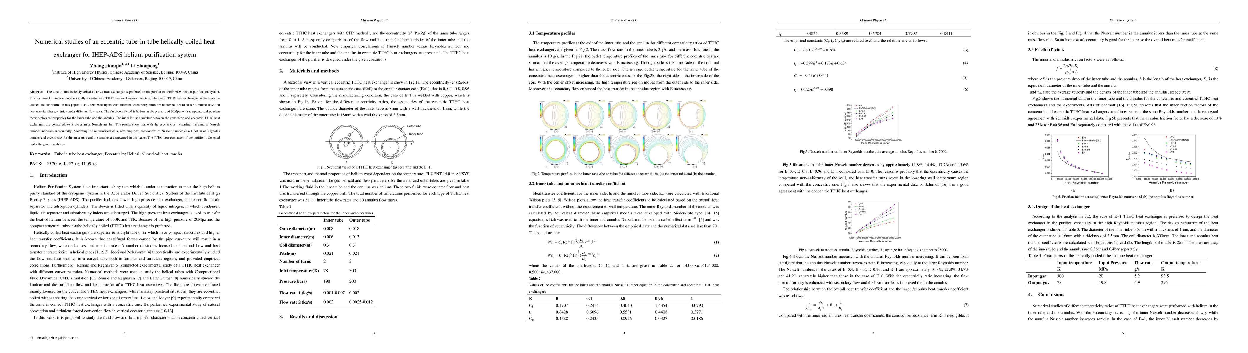 This paper numerically investigates eccentric tube-in-tube helically coiled heat exchangers for the IHEP-ADS helium purification system, finding that increased eccentricity significantly enhances annulus Nusselt number. Empirical correlations for Nusselt number based on Reynolds number and eccentricity are proposed.
