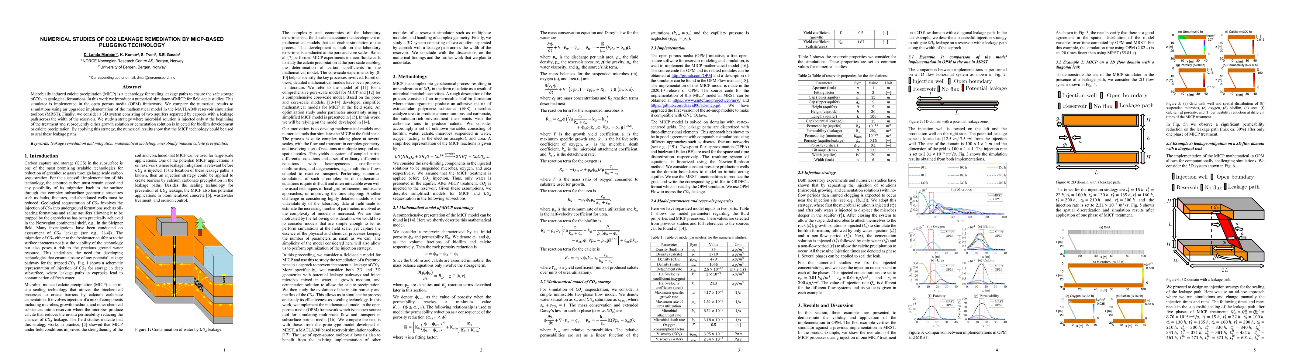 Microbially induced calcite precipitation (MICP) is a technology for sealing leakage paths to ensure the safe storage of CO$_2$ in geological formations. In this work we introduce a numerical simulator of MICP for field-scale studies. This simulator is implemented in the open porous media (OPM) framework. We compare the numerical results to simulations using an upgraded implementation of the mathematical model in the MATLAB reservoir simulation toolbox (MRST). Finally, we consider a 3D system consisting of two aquifers separated by caprock with a leakage path across the width of the reservoir. We study a strategy where microbial solution is injected only at the beginning of the treatment and subsequently either growth solution or cementation solution is injected for biofilm development or calcite precipitation. By applying this strategy, the numerical results show that the MICP technology could be used to seal these leakage paths.