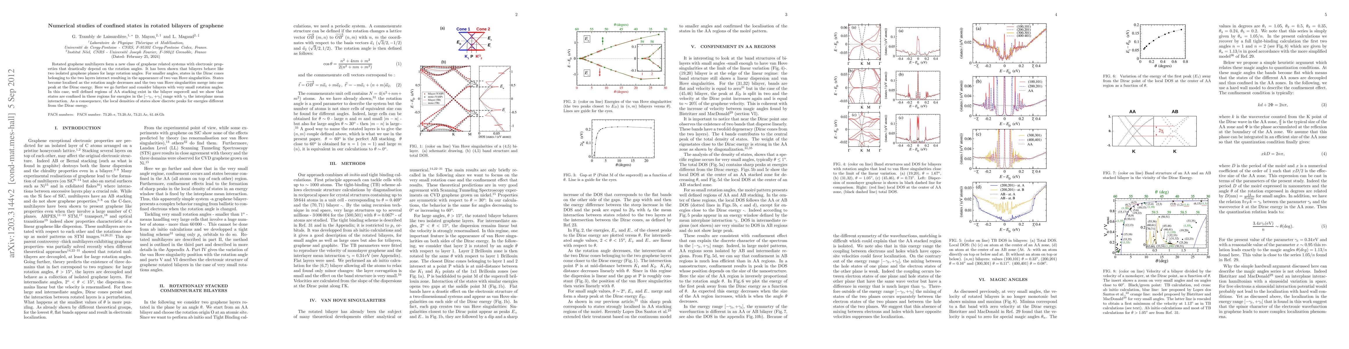 Rotated graphene multilayers form a new class of graphene related systems with electronic properties that drastically depend on the rotation angles. It has been shown that bilayers behave like two isolated graphene planes for large rotation angles. For smaller angles, states in the Dirac cones belonging to the two layers interact resulting in the appearance of two van Hove singularities. States become localised as the rotation angle decreases and the two van Hove singularities merge into one peak at the Dirac energy. Here we go further and consider bilayers with very small rotation angles. In this case, well defined regions of AA stacking exist in the bilayer supercell and we show that states are confined in these regions for energies in the [-\gamma_t, +\gamma_t] range with \gamma_t the interplane mean interaction. As a consequence, the local densities of states show discrete peaks for energies different from the Dirac energy.