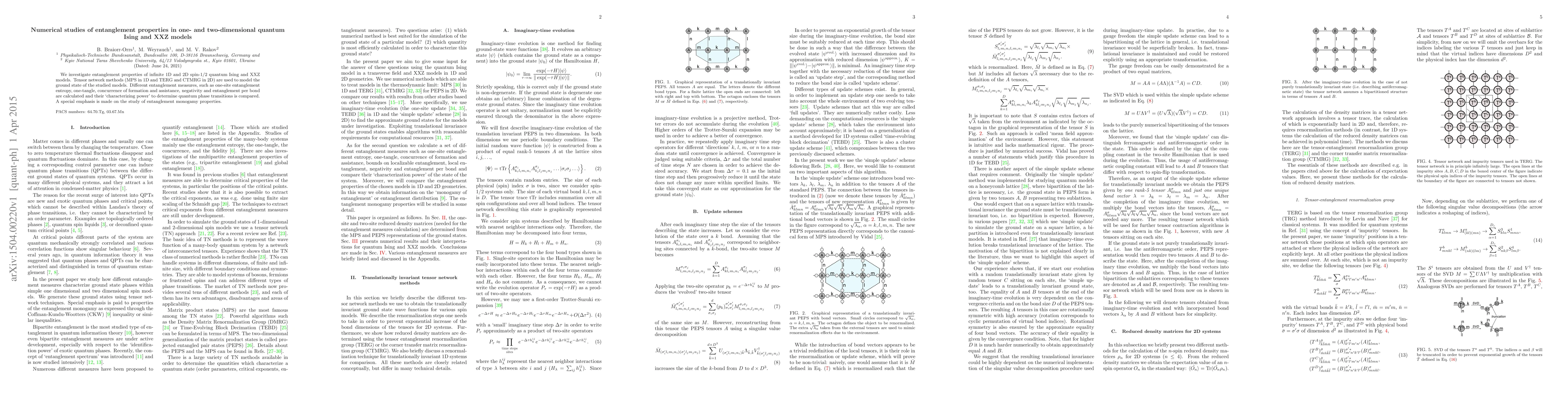 This paper uses tensor network methods to study the entanglement properties in one- and two-dimensional quantum Ising and XXZ models, calculating various entanglement measures to compare their effectiveness in characterizing quantum phase transitions and examining entanglement monogamy properties.