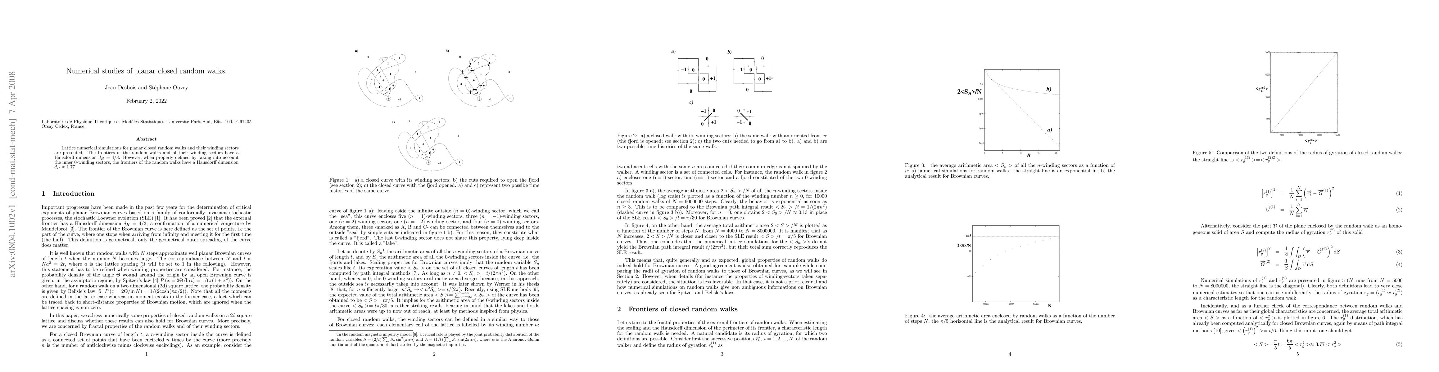 Lattice numerical simulations for planar closed random walks and their winding sectors are presented. The frontiers of the random walks and of their winding sectors have a Hausdorff dimension $d_H=4/3$. However, when properly defined by taking into account the inner 0-winding sectors, the frontiers of the random walks have a Hausdorff dimension $d_H\approx 1.77$.