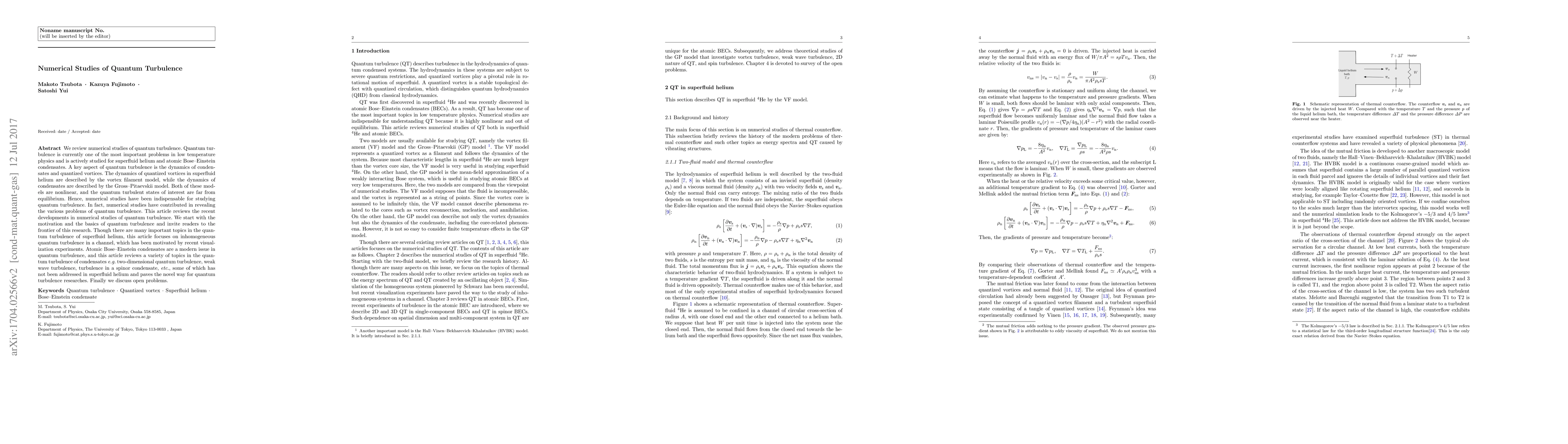 Numerical studies of quantum turbulence review recent developments in modeling condensates and quantized vortices using nonlinear models like the Gross-Pitaevskii model, with implications for understanding superfluid helium and atomic Bose-Einstein condensates.