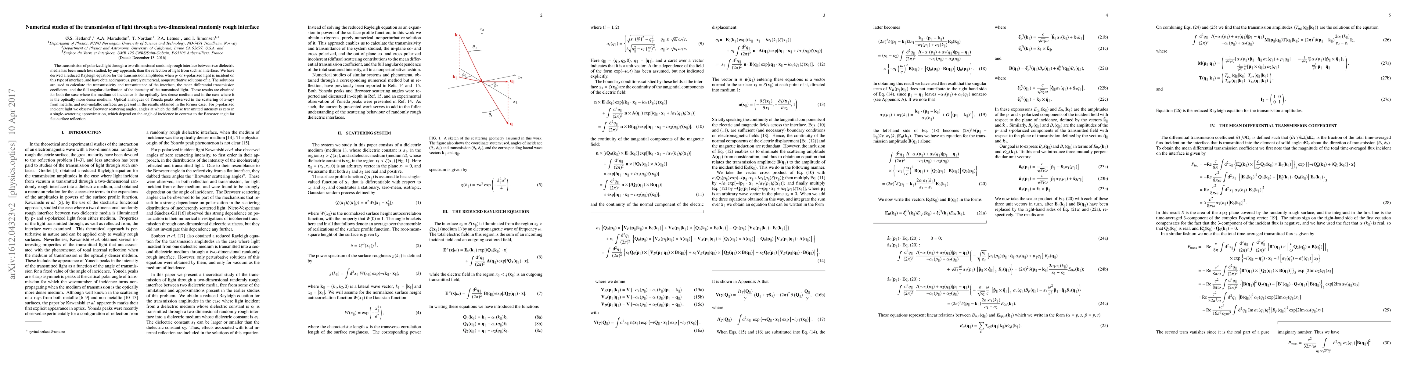 This paper presents numerical studies of light transmission through a two-dimensional randomly rough interface, deriving a reduced Rayleigh equation for transmission amplitudes and obtaining nonperturbative solutions. The study calculates transmissivity, transmittance, and angular distribution of transmitted light, revealing optical analogues of Yoneda peaks and Brewster scattering angles for p-polarized light.