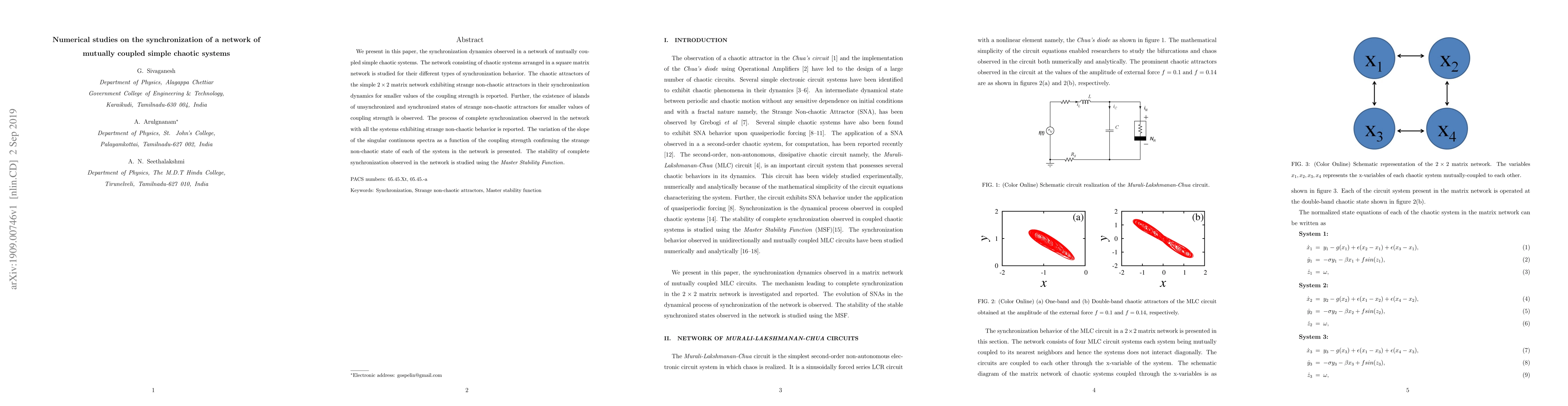 This paper investigates the synchronization dynamics in a network of mutually coupled simple chaotic systems arranged in a $2 \times 2$ matrix. It reports strange non-chaotic attractors and islands of unsynchronized states under small coupling strengths, along with complete synchronization and stability analysis using the Master Stability Function.