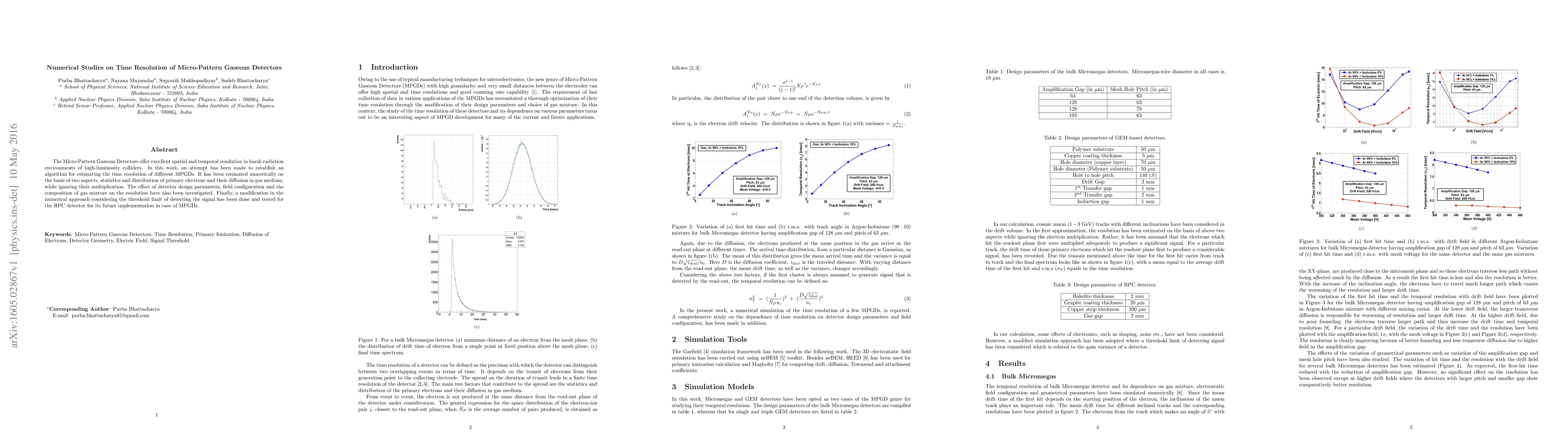 The Micro-Pattern Gaseous Detectors offer excellent spatial and temporal resolution in harsh radiation environments of high-luminosity colliders. In this work, an attempt has been made to establish an algorithm for estimating the time resolution of different MPGDs. It has been estimated numerically on the basis of two aspects, statistics and distribution of primary electrons and their diffusion in gas medium, while ignoring their multiplication. The effect of detector design parameters, field configuration and the composition of gas mixture on the resolution have also been investigated. Finally, a modification in the numerical approach considering the threshold limit of detecting the signal has been done and tested for the RPC detector for its future implementation in case of MPGDs.