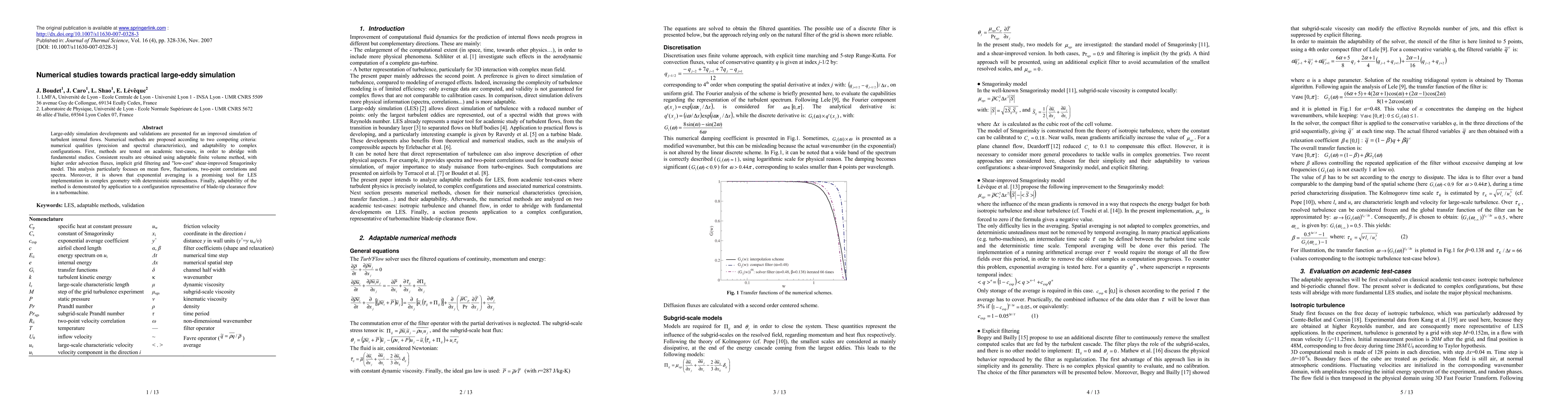 Large-eddy simulation developments and validations are presented for an improved simulation of turbulent internal flows. Numerical methods are proposed according to two competing criteria: numerical qualities (precision and spectral characteristics), and adaptability to complex configurations. First, methods are tested on academic test-cases, in order to abridge with fundamental studies. Consistent results are obtained using adaptable finite volume method, with higher order advection fluxes, implicit grid filtering and "low-cost" shear-improved Smagorinsky model. This analysis particularly focuses on mean flow, fluctuations, two-point correlations and spectra. Moreover, it is shown that exponential averaging is a promising tool for LES implementation in complex geometry with deterministic unsteadiness. Finally, adaptability of the method is demonstrated by application to a configuration representative of blade-tip clearance flow in a turbomachine.