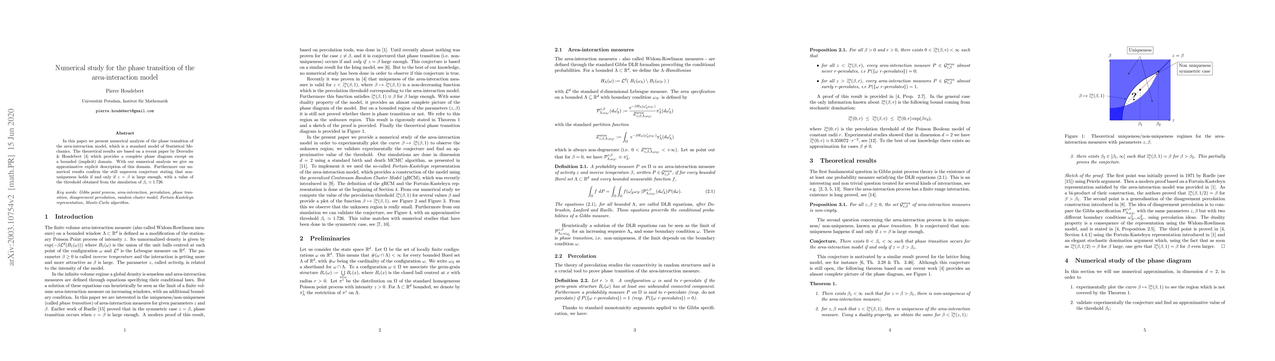 In this paper we present numerical analysis of the phase transition of the area-interaction model, which is a standard model of Statistical Mechanics. The theoretical results are based on a recent paper by Dereudre \& Houdebert \cite{dereudre_houdebert_2018_SharpTransitionWR} which provides a complete phase diagram except on a bounded (implicit) domain. With our numerical analysis we give an approximative explicit description of this domain. %This region is related to the theoretical function $\beta \mapsto \widetilde{z}_c^a(\beta, 1)$ which is percolation threshold of the model, for given $\beta$. %We provide a numerical approximation of this function in order to fully understand the phase diagram. Furthermore our numerical results confirm the still unproven conjecture stating that non-uniqueness holds if and only if $z= \beta$ is large enough, with a value of the threshold obtained from the simulation of $\beta_c \simeq 1.726$.