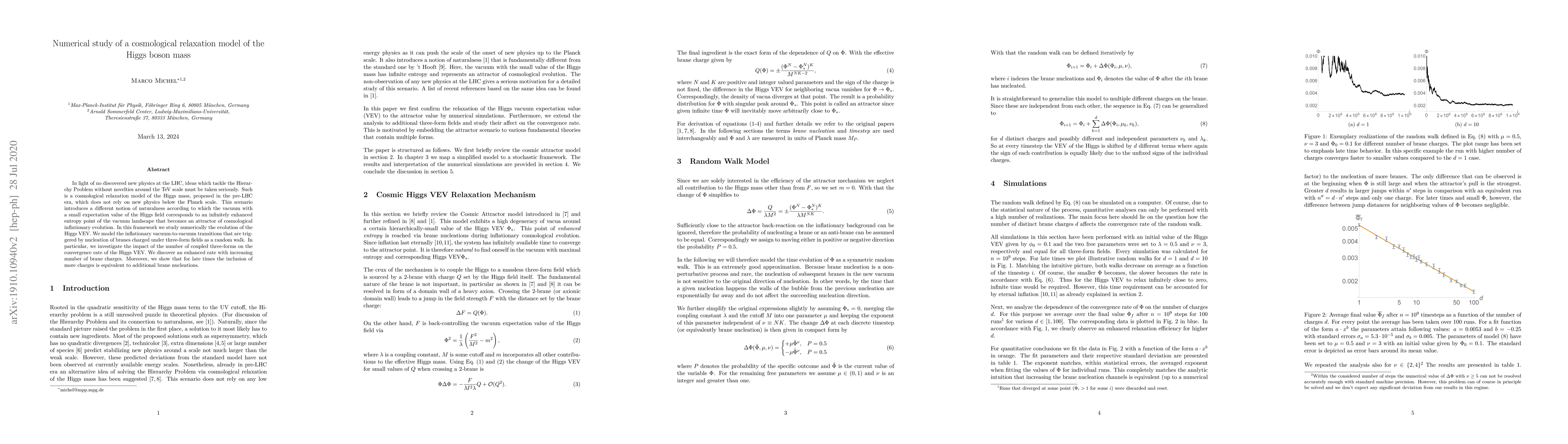 In light of no discovered new physics at the LHC, ideas which tackle the Hierarchy Problem without novelties around the TeV scale must be taken seriously. Such is a cosmological relaxation model of the Higgs mass, proposed in the pre-LHC era, which does not rely on new physics below the Planck scale. This scenario introduces a different notion of naturalness according to which the vacuum with a small expectation value of the Higgs field corresponds to an infinitely enhanced entropy point of the vacuum landscape that becomes an attractor of cosmological inflationary evolution. In this framework we study numerically the evolution of the Higgs VEV. We model the inflationary vacuum-to-vacuum transitions that are triggered by nucleation of branes charged under three-form fields as a random walk. In particular, we investigate the impact of the number of coupled three-forms on the convergence rate of the Higgs VEV. We discover an enhanced rate with increasing number of brane charges. Moreover, we show that for late times the inclusion of more charges is equivalent to additional brane nucleations.