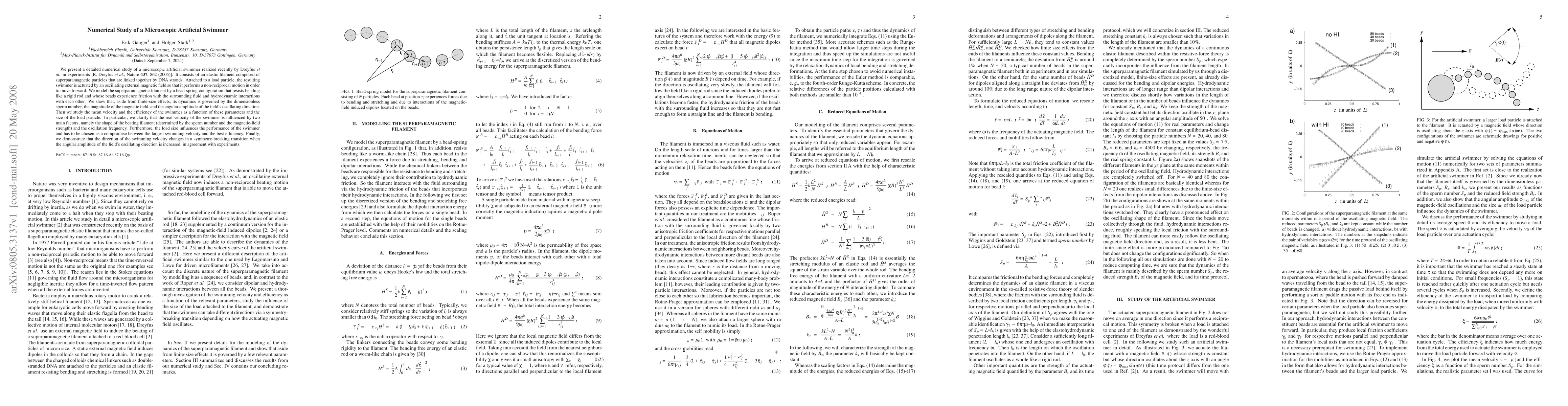We present a detailed numerical study of a microscopic artificial swimmer realized recently by Dreyfus et al. in experiments [R. Dreyfus et al., Nature 437, 862 (2005)]. It consists of an elastic filament composed of superparamagnetic particles that are linked together by DNA strands. Attached to a load particle, the resulting swimmer is actuated by an oscillating external magnetic field so that it performs a non-reciprocal motion in order to move forward. We model the superparamagnetic filament by a bead-spring configuration that resists bending like a rigid rod and whose beads experience friction with the surrounding fluid and hydrodynamic interactions with each other. We show that, aside from finite-size effects, its dynamics is governed by the dimensionless sperm number, the magnitude of the magnetic field, and the angular amplitude of the field's oscillating direction. Then we study the mean velocity and the efficiency of the swimmer as a function of these parameters and the size of the load particle. In particular, we clarify that the real velocity of the swimmer is influenced by two main factors, namely the shape of the beating filament (determined by the sperm number and the magnetic-field strength) and the oscillation frequency. Furthermore, the load size influences the performance of the swimmer and has to be chosen as a compromise between the largest swimming velocity and the best efficiency. Finally, we demonstrate that the direction of the swimming velocity changes in a symmetry-breaking transition when the angular amplitude of the field's oscillating direction is increased, in agreement with experiments.