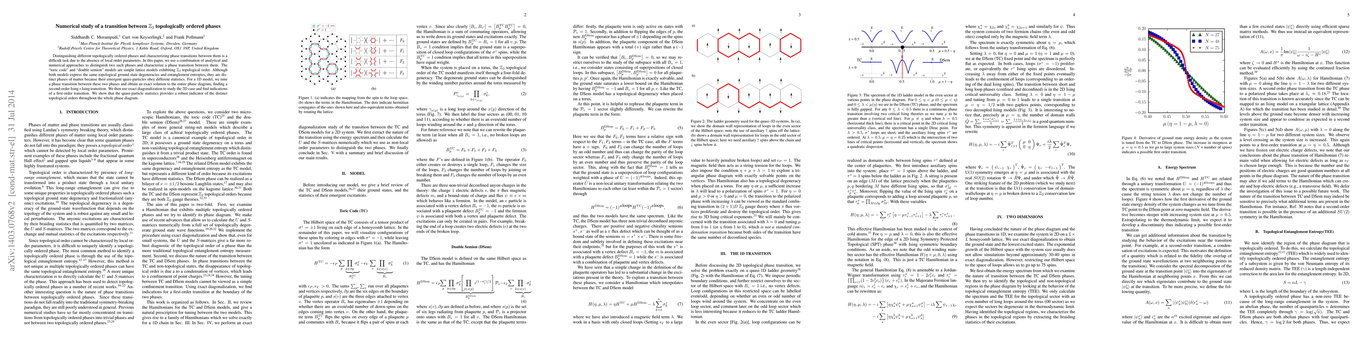 This research numerically investigates the transition between Z2 topologically ordered phases using lattice models like "toric code" and "double semion," revealing distinct quasi-particle statistics. The study finds a second-order Ising transition in 1D and suggests a first-order transition in 2D, with quasi-particle statistics serving as a reliable indicator of topological order.