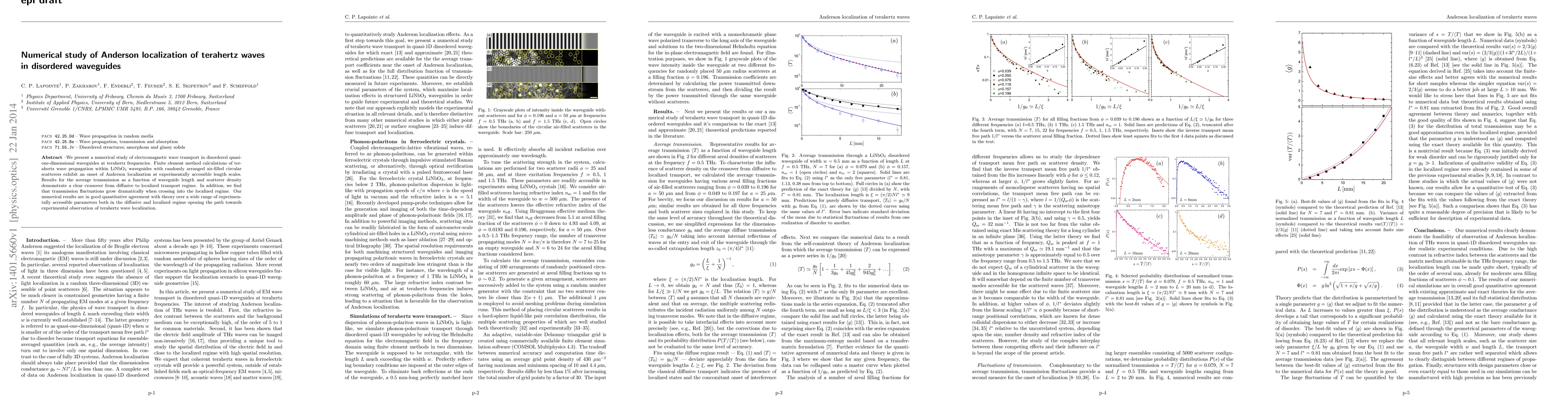 This paper numerically investigates the Anderson localization of terahertz waves in disordered waveguides using finite element methods. The study reveals a transition from diffusive to localized transport and significant transmission fluctuations in the localized regime, aligning well with theoretical predictions.