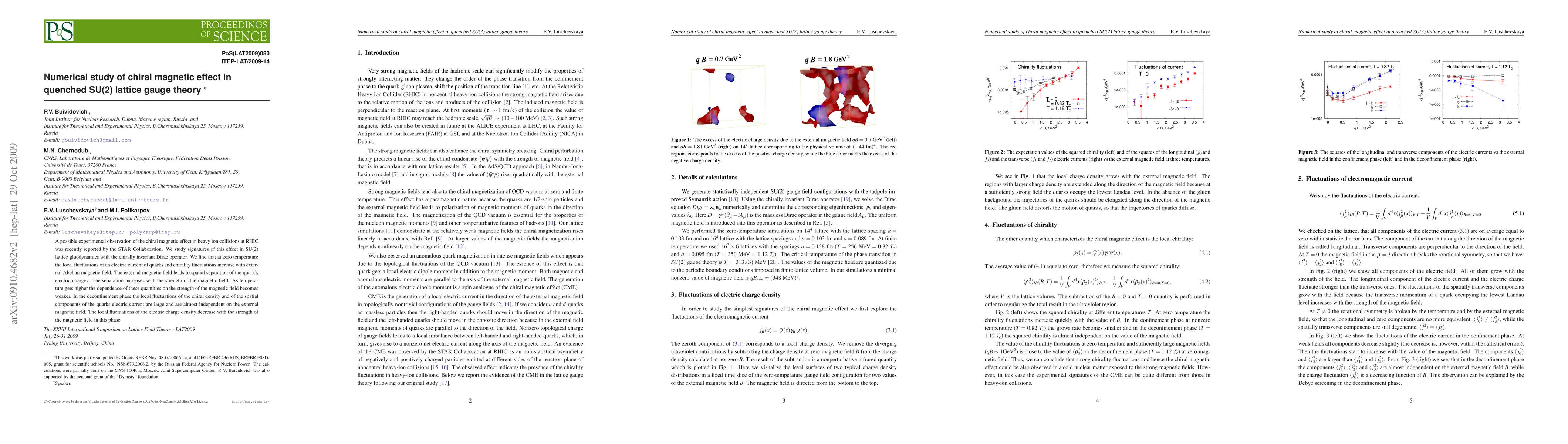 A possible experimental observation of the chiral magnetic effect in heavy ion collisions at RHIC was recently reported by the STAR Collaboration. We study signatures of this effect in SU(2) lattice gluodynamics with the chirally invariant Dirac operator. We find that at zero temperature the local fluctuations of an electric current of quarks and chirality fluctuations increase with external Abelian magnetic field. The external magnetic field leads to spatial separation of the quark's electric charges. The separation increases with the strength of the magnetic field. As temperature gets higher the dependence of these quantities on the strength of the magnetic field becomes weaker. In the deconfinement phase the local fluctuations of the chiral density and of the spatial components of the quarks electric current are large and are almost independent on the external magnetic field. The local fluctuations of the electric charge density decrease with the strength of the magnetic field in this phase.