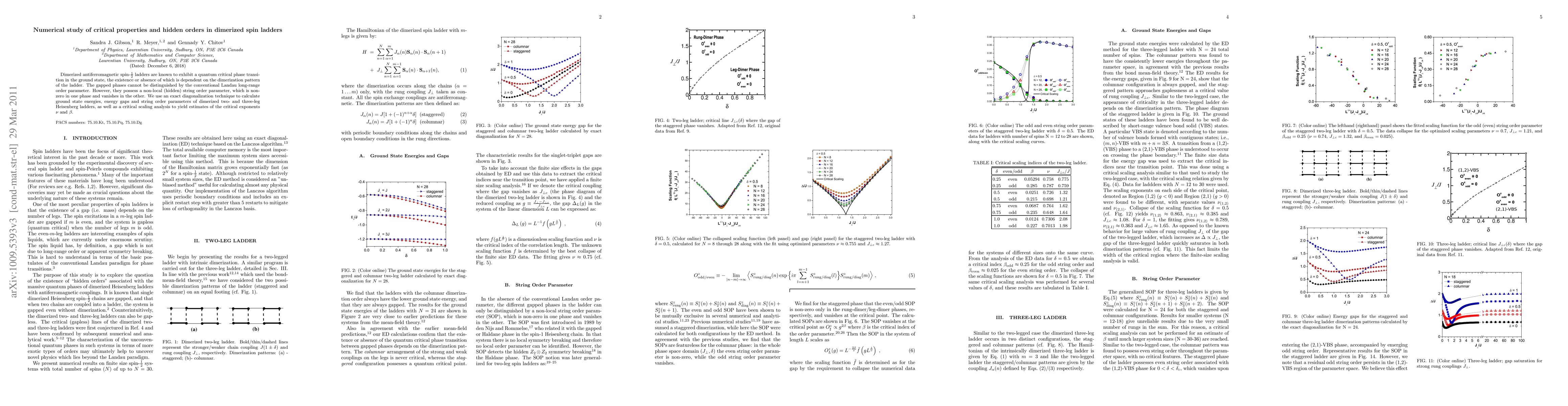 This paper investigates the critical properties and hidden orders in dimerized spin-1/2 ladders using exact diagonalization and critical scaling analysis. It finds that these systems exhibit a quantum critical phase transition, characterized by a non-local string order parameter, and determines the critical exponents ν and β.