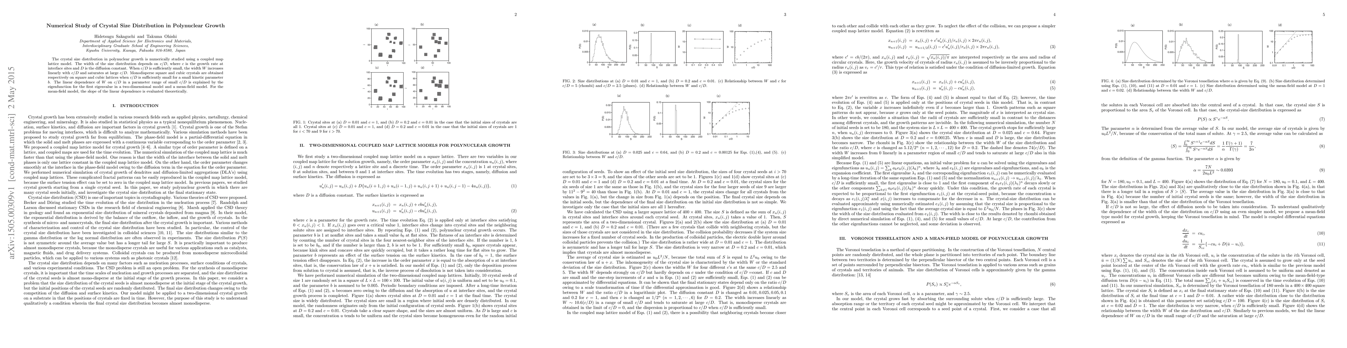 Researchers used a numerical model to study how crystal size distribution changes with growth rate and diffusion constant in polynuclear growth. They found that the distribution width increases linearly with growth rate at small values of the ratio.