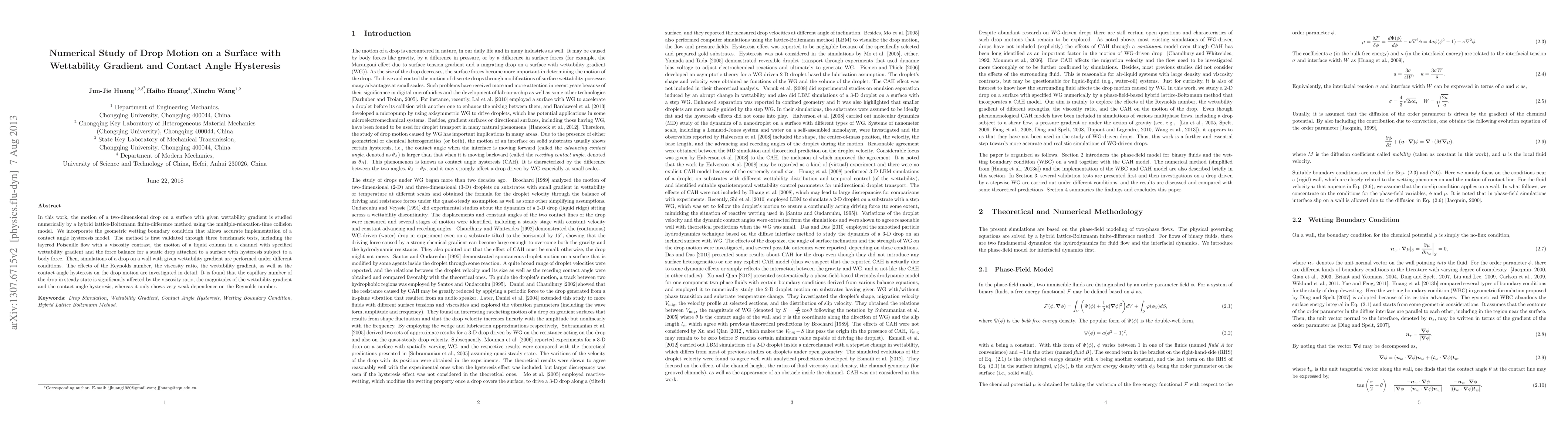 This research numerically investigates the motion of a 2-D drop on a surface with a wettability gradient using a hybrid lattice-Boltzmann finite-difference method, focusing on contact angle hysteresis effects. Simulations reveal significant influences of viscosity ratio, wettability gradient, and contact angle hysteresis on the drop's capillary number, with minimal impact from the Reynolds number.