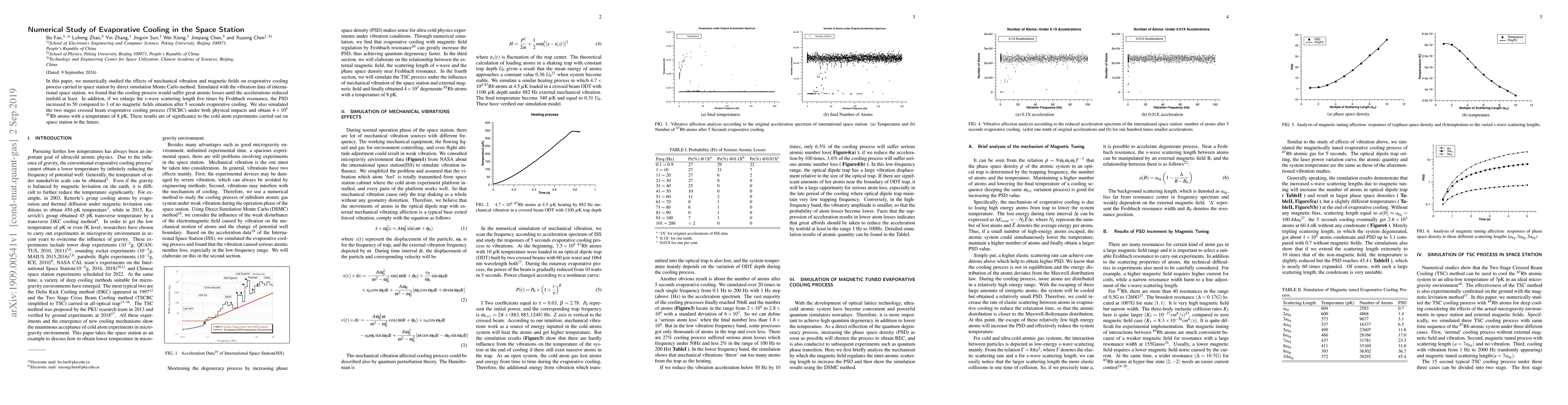 In this paper, we numerically studied the effects of mechanical vibration and magnetic fields on evaporative cooling process carried in space station by direct simulation Monte Carlo method. Simulated with the vibration data of international space station, we found that the cooling process would suffer great atomic losses until the accelerations reduced tenfold at least. In addition, if we enlarge the s-wave scattering length five times by Feshbach resonance, the PSD increased to 50 compared to 3 of no magnetic fields situation after 5 seconds evaporative cooling. We also simulated the two stages crossed beam evaporative cooling process (TSCBC) under both physical impacts and obtain $4\times10^5$ $^{85}$Rb atoms with a temperature of 8 pK. These results are of significance to the cold atom experiments carried out on space station in the future.