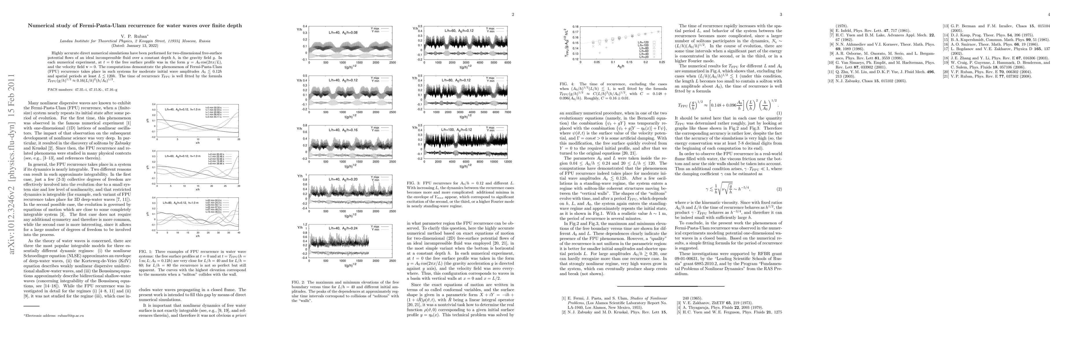 This paper presents highly accurate simulations of two-dimensional water waves showing the Fermi-Pasta-Ulam recurrence phenomenon for moderate initial wave amplitudes and spatial periods. The recurrence time is well described by a formula involving gravity, depth, wavelength, and amplitude.