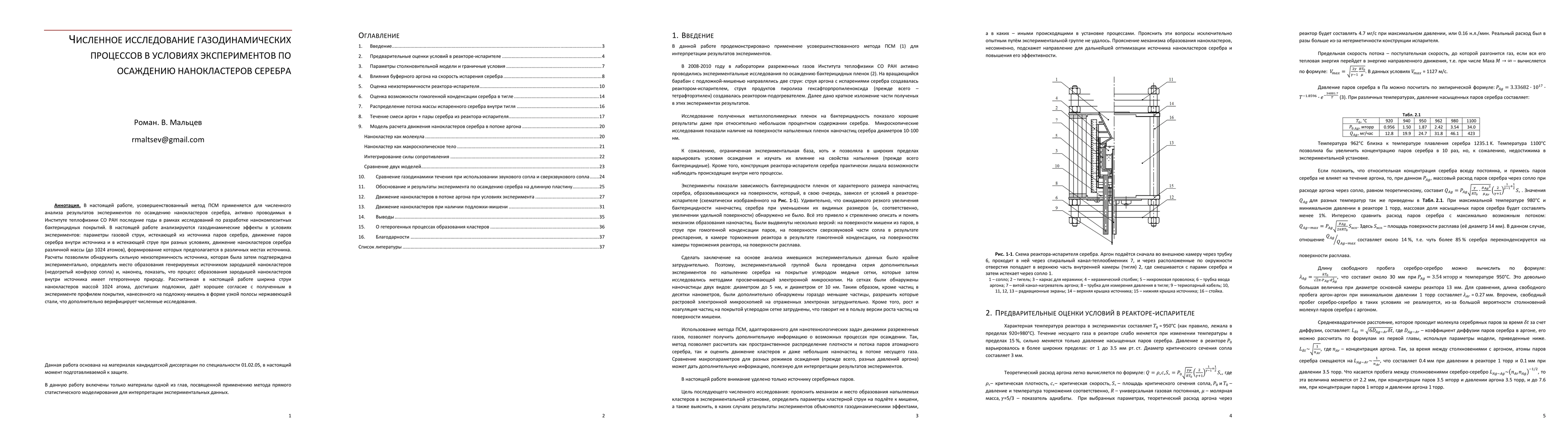 In this paper, experiments on the deposition of silver nanoclusters are analysed numerically using improved DSMC method. These experiments were made in the Institute of Thermophysics SB RAS recent years, in the context of the development of bactericidal nanocomposite coatings deposition technology. In this paper we analyze the gas-dynamic effects in experimental conditions: the parameters of the gas stream from the silver vapor source, the flow of silver vapors inside the source and in the outflowing jet under different conditions, the movement of silver nanoclusters of different masses (up to 1024 atoms) in buffer gas, expecting different places of nanocluster formation in a source. The simulations revealed a strong nonisothermal state of the source, which was later confirmed experimentally, the site of nanocluster nulceus formation in a source (subcooled confuser of the nozzle) and, finally, show that the process of nucleation of nanoclusters inside a source is of heterogeneous nature. The width of the silver nanocluster jet (of mass 1024 atoms) reaching target according to sumulations, is in good agreement with that obtained in the experiment coating profile on the target substrate in a form of narrow strip made of stainless steel, that further validates the numerical simulations.