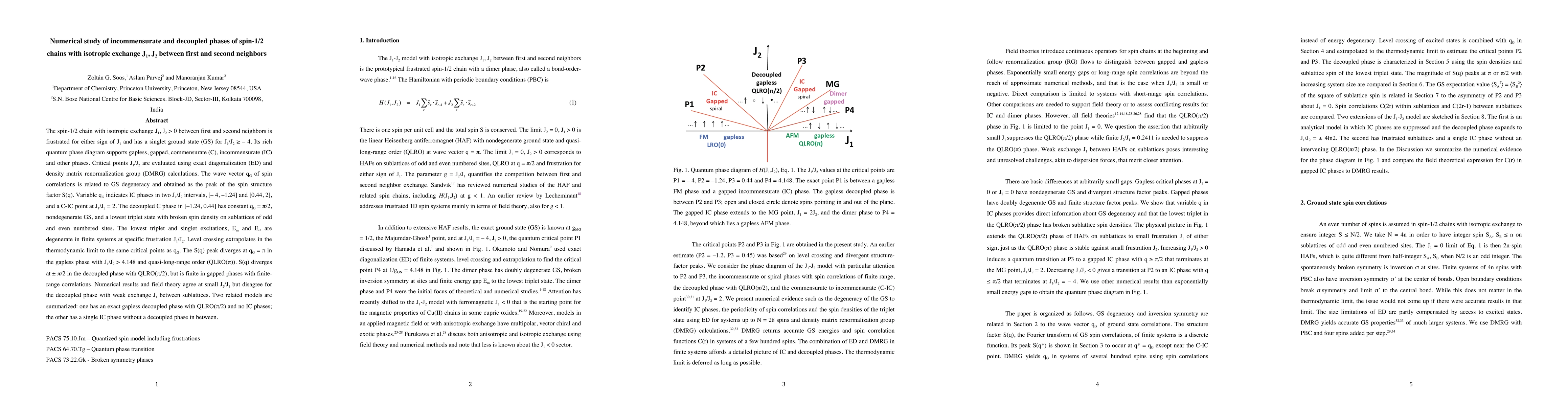 This paper investigates the spin-1/2 chain with isotropic exchange interactions between first and second neighbors, revealing a complex quantum phase diagram featuring gapless, gapped, commensurate, and incommensurate phases. Numerical methods identify critical points and IC phases in two intervals, with a C-IC transition at J1/J2 = 2, and highlight the relationship between spin correlations and ground state degeneracy.