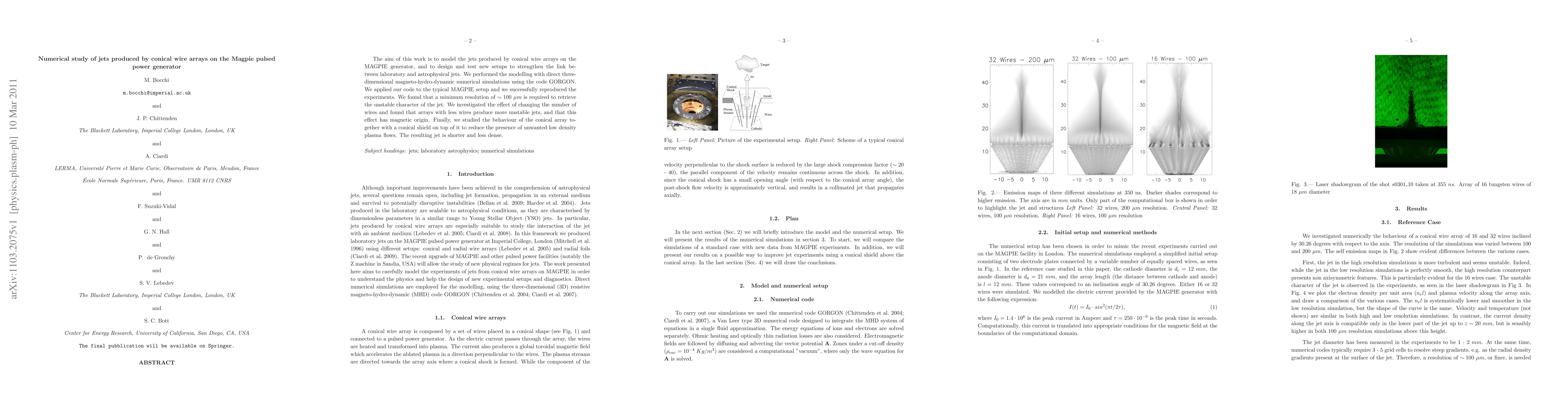 The aim of this work is to model the jets produced by conical wire arrays on the MAGPIE generator, and to design and test new setups to strengthen the link between laboratory and astrophysical jets. We performed the modelling with direct three-dimensional magneto-hydro-dynamic numerical simulations using the code GORGON. We applied our code to the typical MAGPIE setup and we successfully reproduced the experiments. We found that a minimum resolution of approximately 100 is required to retrieve the unstable character of the jet. We investigated the effect of changing the number of wires and found that arrays with less wires produce more unstable jets, and that this effect has magnetic origin. Finally, we studied the behaviour of the conical array together with a conical shield on top of it to reduce the presence of unwanted low density plasma flows. The resulting jet is shorter and less dense.
