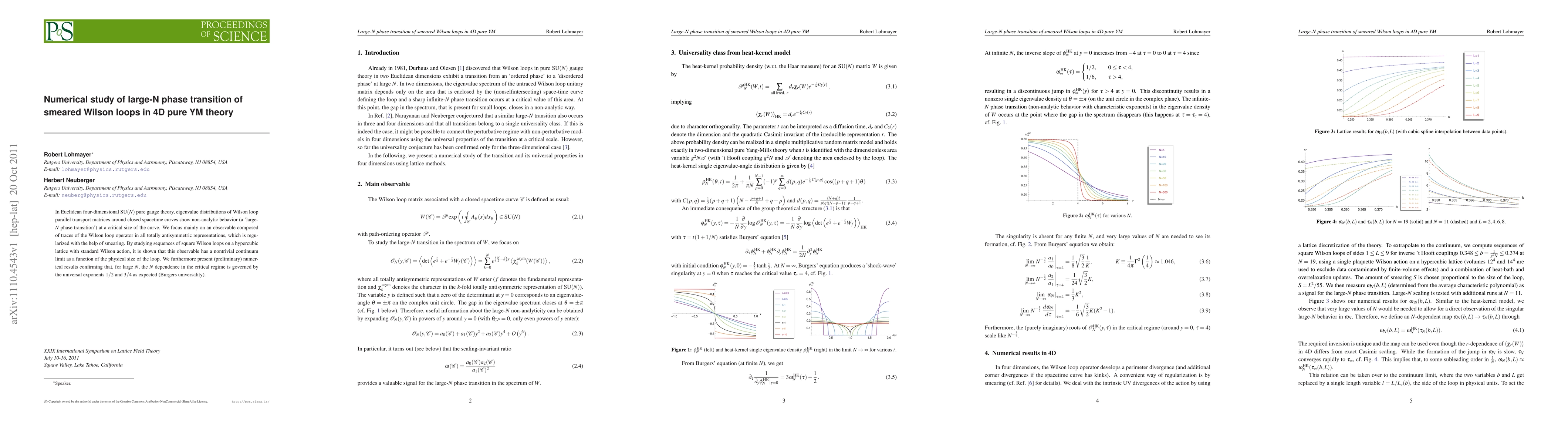This paper investigates the large-N phase transition in 4D SU(N) pure Yang-Mills theory, focusing on smeared Wilson loops. It demonstrates that the observable composed of traces of Wilson loops in antisymmetric representations has a nontrivial continuum limit, and presents numerical evidence supporting the universality of critical exponents 1/2 and 3/4 for large N.