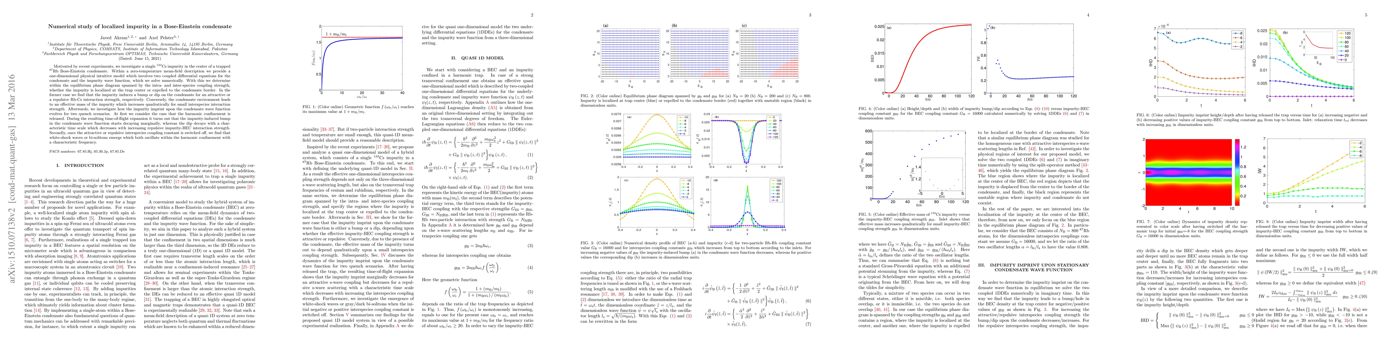 Motivated by recent experiments, we investigate a single $^{133}\text{Cs}$ impurity in the center of a trapped $^{87}\text{Rb}$ Bose-Einstein condensate. Within a zero-temperature mean-field description we provide a one-dimensional physical intuitive model which involves two coupled differential equations for the condensate and the impurity wave function, which we solve numerically. With this we determine within the equilibrium phase diagram spanned by the intra- and inter-species coupling strength, whether the impurity is localized at the trap center or expelled to the condensate border. In the former case we find that the impurity induces a bump or dip on the condensate for an attractive or a repulsive Rb-Cs interaction strength, respectively. Conversely, the condensate environment leads to an effective mass of the impurity which increases quadratically for small interspecies interaction strength. Afterwards, we investigate how the impurity imprint upon the condensate wave function evolves for two quench scenarios. At first we consider the case that the harmonic confinement is released. During the resulting time-of-flight expansion it turns out that the impurity-induced bump in the condensate wave function starts decaying marginally, whereas the dip decays with a characteristic time scale which decreases with increasing repulsive impurity-BEC interaction strength. Secondly, once the attractive or repulsive interspecies coupling constant is switched off, we find that white-shock waves or bi-solitons emerge which both oscillate within the harmonic confinement with a characteristic frequency.