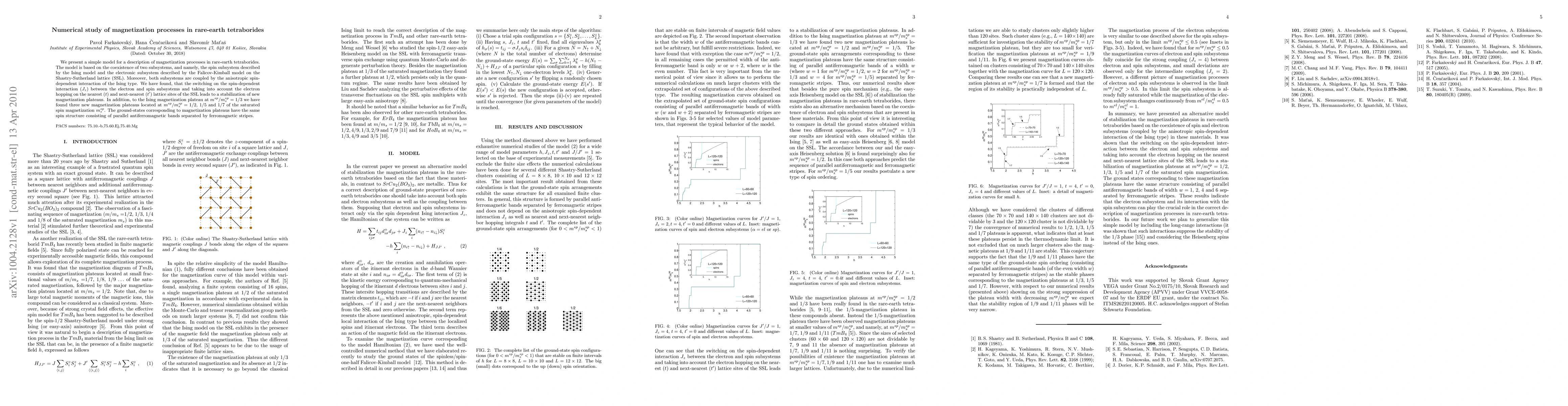 We present a simple model for a description of magnetization processes in rare-earth tetraborides. The model is based on the coexistence of two subsystems, and namely, the spin subsystem described by the Ising model and the electronic subsystem described by the Falicov-Kimball model on the Shastry-Sutherland lattice (SSL). Moreover, both subsystems are coupled by the anisotropic spin-dependent interaction of the Ising type. We have found, that the switching on the spin-dependent interaction ($J_z$) between the electron and spin subsystems and taking into account the electron hopping on the nearest ($t$) and next-nearest ($t'$) lattice sites of the SSL leads to a stabilization of new magnetization plateaus. In addition, to the Ising magnetization plateau at $m^{sp}/m_s^{sp}=1/3$ we have found three new magnetization plateaus located at $m^{sp}/m_s^{sp}=1/2$, 1/5 and 1/7 of the saturated spin magnetization $m_s^{sp}$. The ground-states corresponding to magnetization plateaus have the same spin structure consisting of parallel antiferromagnetic bands separated by ferromagnetic stripes.