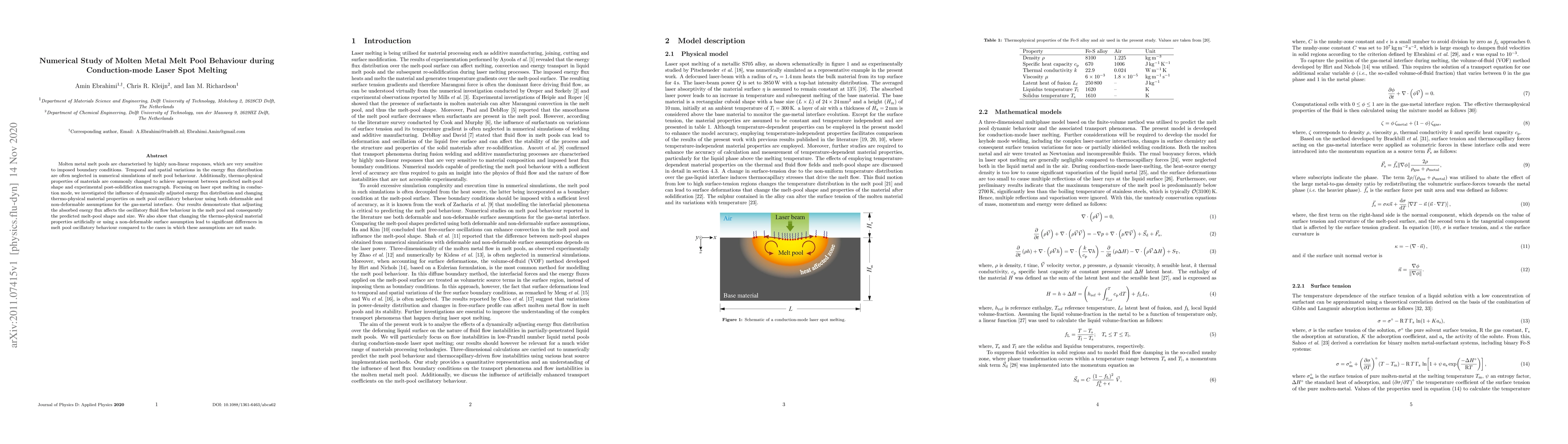 This study investigates the impact of dynamically adjusted energy flux and varying thermo-physical material properties on molten metal melt pool behavior during conduction-mode laser spot melting. Results show that absorbed energy flux adjustments influence melt pool oscillatory behavior and shape, while non-deformable surface assumptions significantly alter these dynamics.