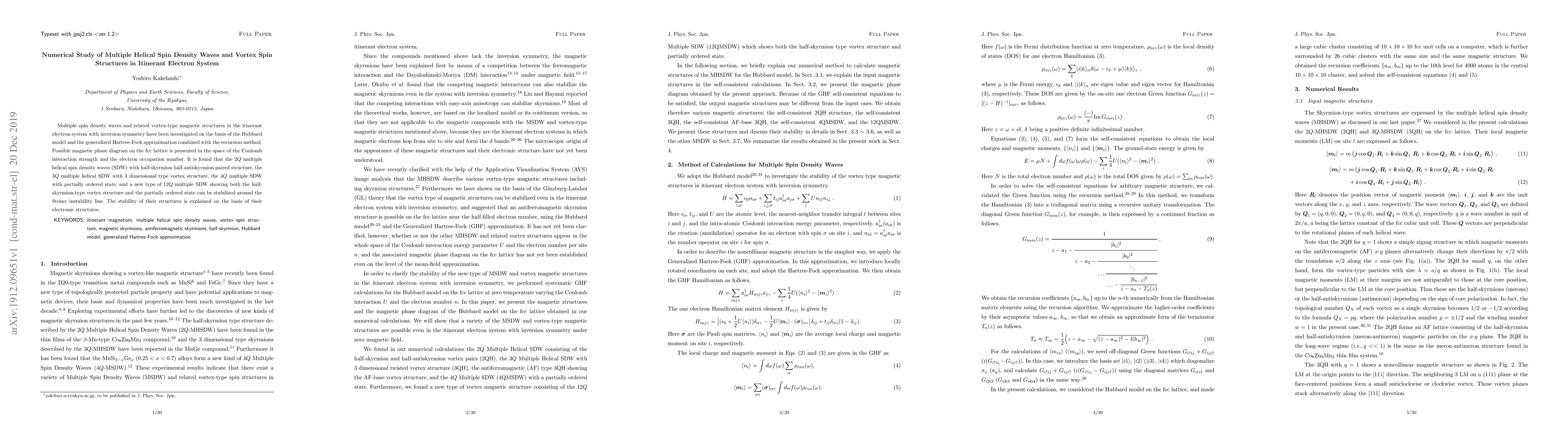 Multiple spin density waves and related vortex-type magnetic structures in the itinerant electron system with inversion symmetry have been investigated on the basis of the Hubbard model and the generalized Hartree-Fock approximation combined with the recursion method. Possible magnetic phase diagram on the fcc lattice is presented in the space of the Coulomb interaction strength and the electron occupation number. It is found that the 2Q multiple helical spin density waves (SDW) with half-skyrmion half-antiskyrmion paired structure, the 3Q multiple helical SDW with 3 dimensional type vortex structure, the 4Q multiple SDW with partially ordered state, and a new type of 12Q multiple SDW showing both the half-skyrmion-type vortex structure and the partially ordered state can be stabilized around the Stoner instability line. The stability of their structures is explained on the basis of their electronic structures.