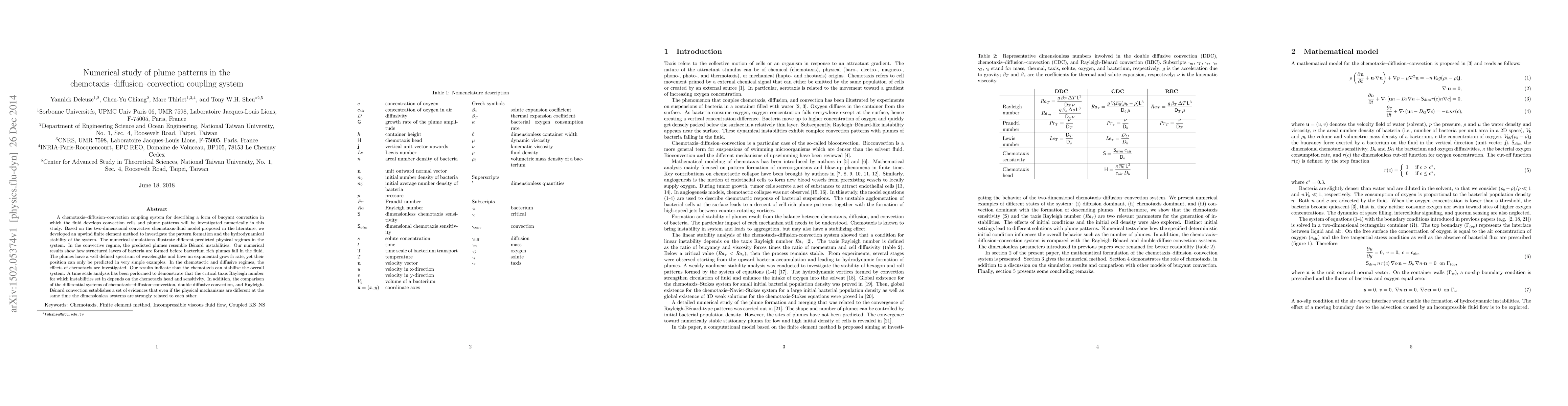 A chemotaxis-diffusion-convection coupling system for describing a form of buoyant convection in which the fluid develops convection cells and plume patterns will be investigated numerically in this study. Based on the two-dimensional convective chemotaxis-fluid model proposed in the literature, we developed an upwind finite element method to investigate the pattern formation and the hydrodynamical stability of the system. The numerical simulations illustrate different predicted physical regimes in the system. In the convective regime, the predicted plumes resemble B\'enard instabilities. Our numerical results show how structured layers of bacteria are formed before bacterium rich plumes fall in the fluid. The plumes have a well defined spectrum of wavelengths and have an exponential growth rate, yet their position can only be predicted in very simple examples. In the chemotactic and diffusive regimes, the effects of chemotaxis are investigated. Our results indicate that the chemotaxis can stabilize the overall system. A time scale analysis has been performed to demonstrate that the critical taxis Rayleigh number for which instabilities set in depends on the chemotaxis head and sensitivity. In addition, the comparison of the differential systems of chemotaxis-diffusion-convection, double diffusive convection, and Rayleigh-B\'enard convection establishes a set of evidences that even if the physical mechanisms are different at the same time the dimensionless systems are strongly related to each other.