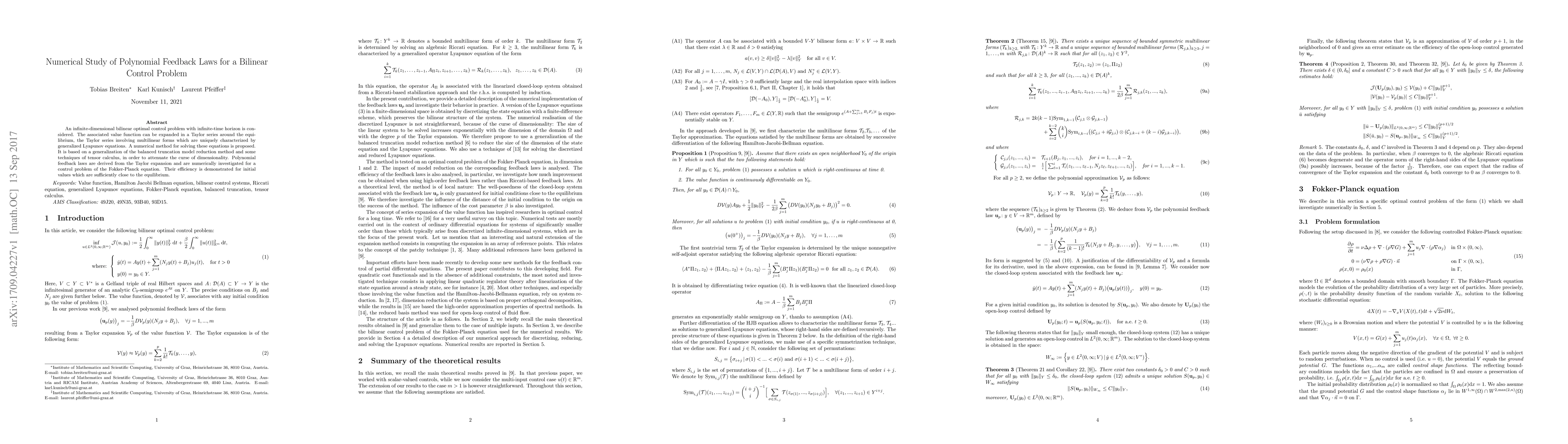 An infinite-dimensional bilinear optimal control problem with infinite-time horizon is considered. The associated value function can be expanded in a Taylor series around the equilibrium, the Taylor series involving multilinear forms which are uniquely characterized by generalized Lyapunov equations. A numerical method for solving these equations is proposed. It is based on a generalization of the balanced truncation model reduction method and some techniques of tensor calculus, in order to attenuate the curse of dimensionality. Polynomial feedback laws are derived from the Taylor expansion and are numerically investigated for a control problem of the Fokker-Planck equation. Their efficiency is demonstrated for initial values which are sufficiently close to the equilibrium.