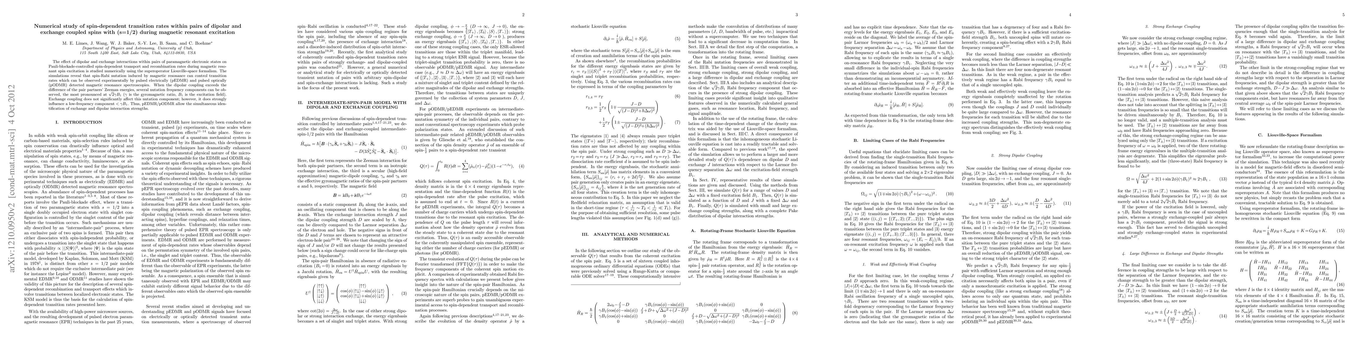 The effect of dipolar and exchange interactions within pairs of paramagnetic electronic states on Pauli-blockade-controlled spin-dependent transport and recombination rates during magnetic resonant spin excitation is studied numerically using the superoperator Liouville-space formalism. The simulations reveal that spin-Rabi nutation induced by magnetic resonance can control transition rates which can be observed experimentally by pulsed electrically (pEDMR) and pulsed optically (pODMR) detected magnetic resonance spectroscopies. When the dipolar coupling exceeds the difference of the pair partners' Zeeman energies, several nutation frequency components can be observed, the most pronounced at sqrt{2} gamma B_1 (gamma is the gyromagnetic ratio, B_1 is the excitation field). Exchange coupling does not significantly affect this nutation component; however, it does strongly influence a low-frequency component < gamma B_1. Thus, pEDMR/pODMR allow the simultaneous identification of exchange and dipolar interaction strengths.