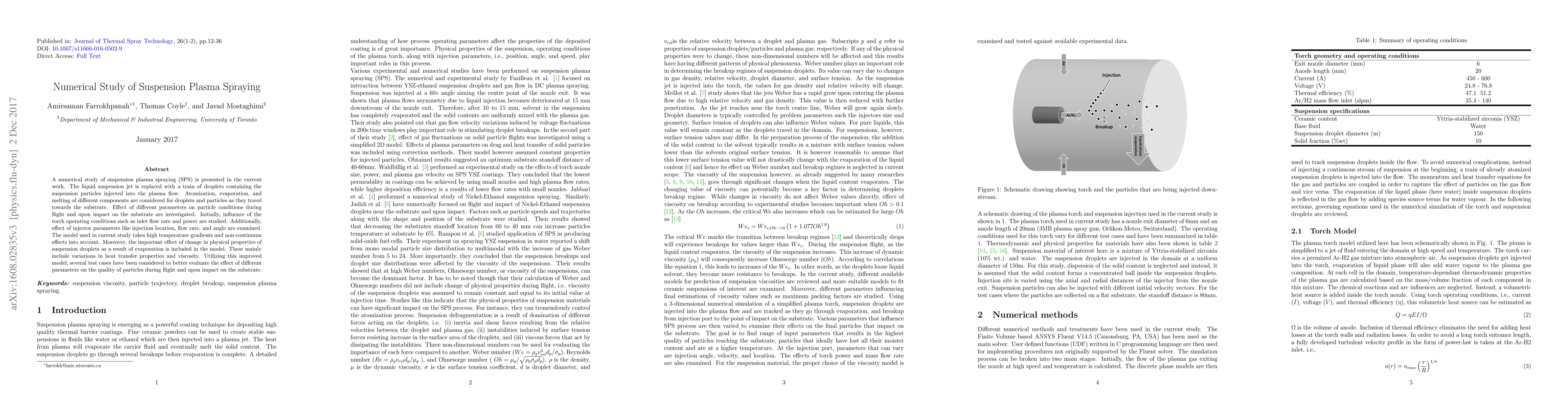 This research numerically investigates suspension plasma spraying (SPS) by simulating droplet and particle behavior, focusing on atomization, evaporation, and melting as they travel to the substrate. The study examines how various parameters, including torch conditions and injector settings, affect particle conditions during flight and upon impact, considering high temperature gradients and non-continuum effects.