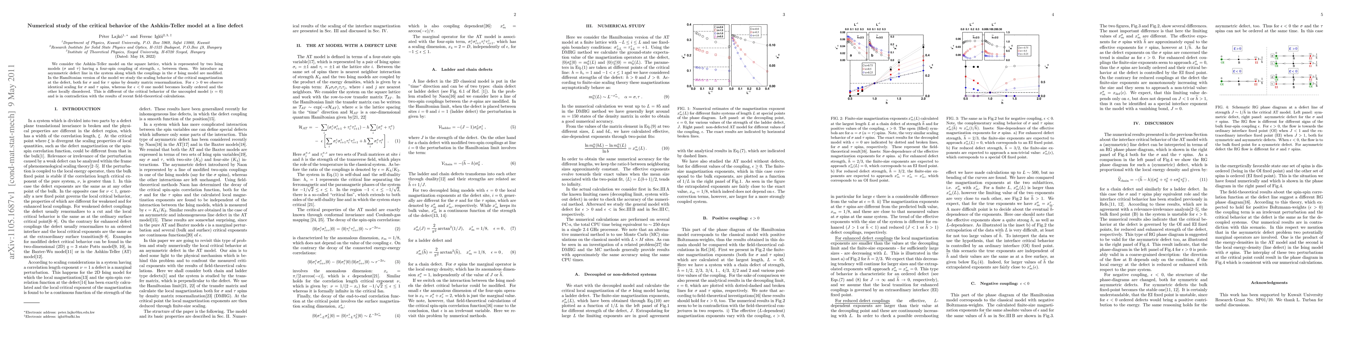 This paper investigates the critical behavior of the Ashkin-Teller model on a square lattice, introducing an asymmetric defect line that modifies $\sigma$ Ising model couplings. The study reveals identical scaling for $\sigma$ and $\tau$ spins when $\epsilon>0$, while $\epsilon<0$ leads to locally ordered and disordered states in one model each, differing from the uncoupled model's behavior and contradicting recent field-theoretical results.