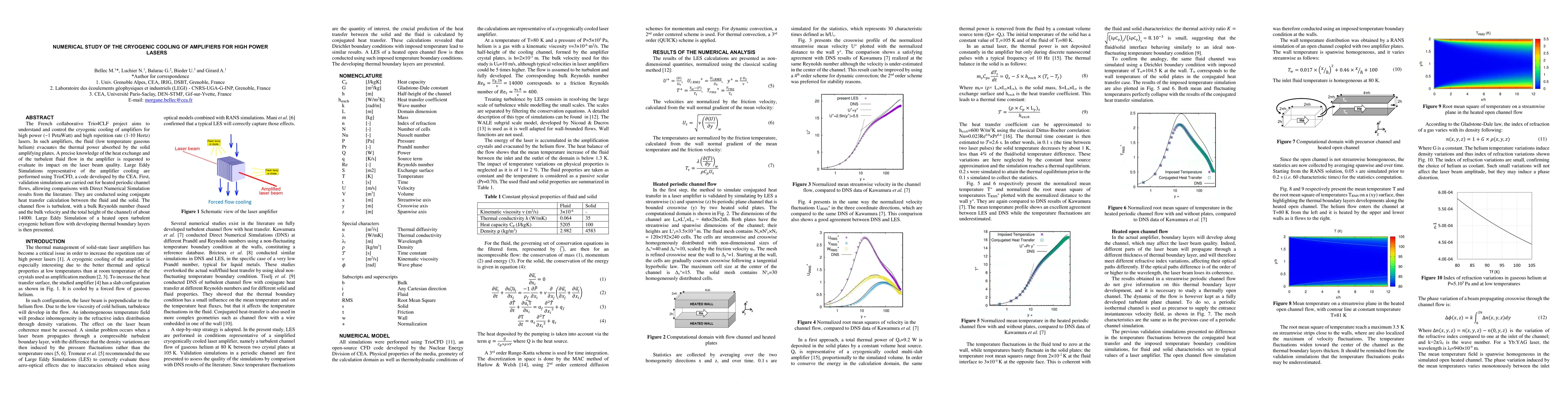 The French collaborative Trio4CLF project aims to understand and control the cryogenic cooling of amplifiers for high power (~1 PetaWatt) and high repetition rate (1-10 Hertz) lasers. In such amplifiers, the fluid (low temperature gaseous helium) evacuates the thermal power absorbed by the solid amplifying plates. A precise knowledge of the heat exchange and of the turbulent fluid flow in the amplifier is requested to evaluate its impact on the laser beam quality. Large Eddy Simulations representative of the amplifier cooling are performed using TrioCFD, a code developed by the CEA. First, validation simulations are carried out for heated periodic channel flows, allowing comparisons with Direct Numerical Simulation results from the literature. They are conducted using conjugate heat transfer calculation between the fluid and the solid. The channel flow is turbulent, with a bulk Reynolds number (based and the bulk velocity and the total height of the channel) of about 14000. Large Eddy Simulation of a heated open turbulent cryogenic helium flow with developing thermal boundary layers is then presented.