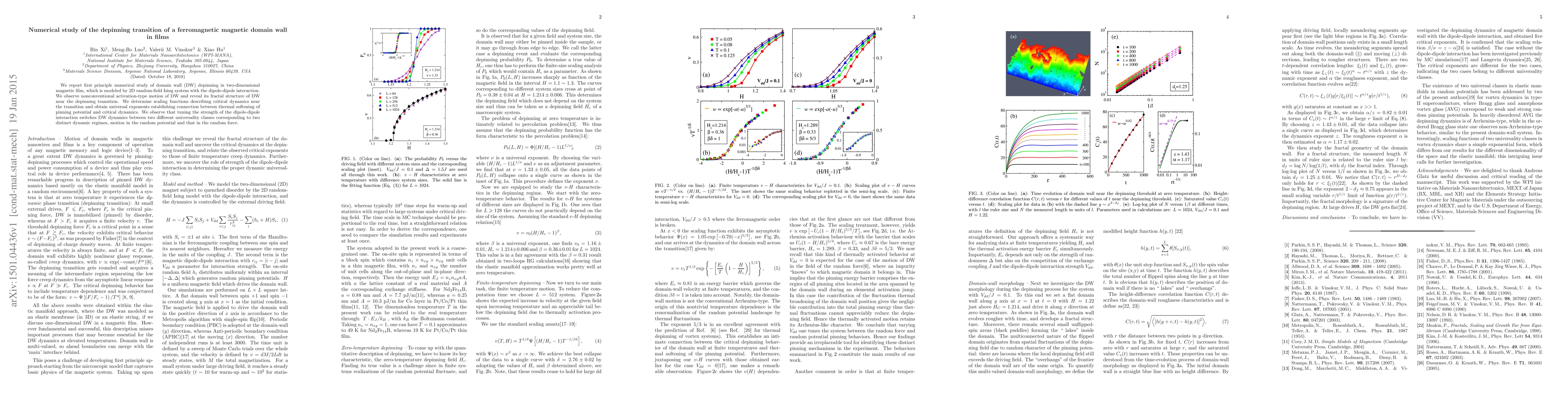 This research investigates the depinning transition of a ferromagnetic magnetic domain wall in a two-dimensional magnetic film using first-principle numerical simulations. The study reveals unconventional activation-type motion and fractal structure near the depinning transition, identifies scaling functions, and finds universal exponents linking thermal softening of the pinning potential to critical dynamics.