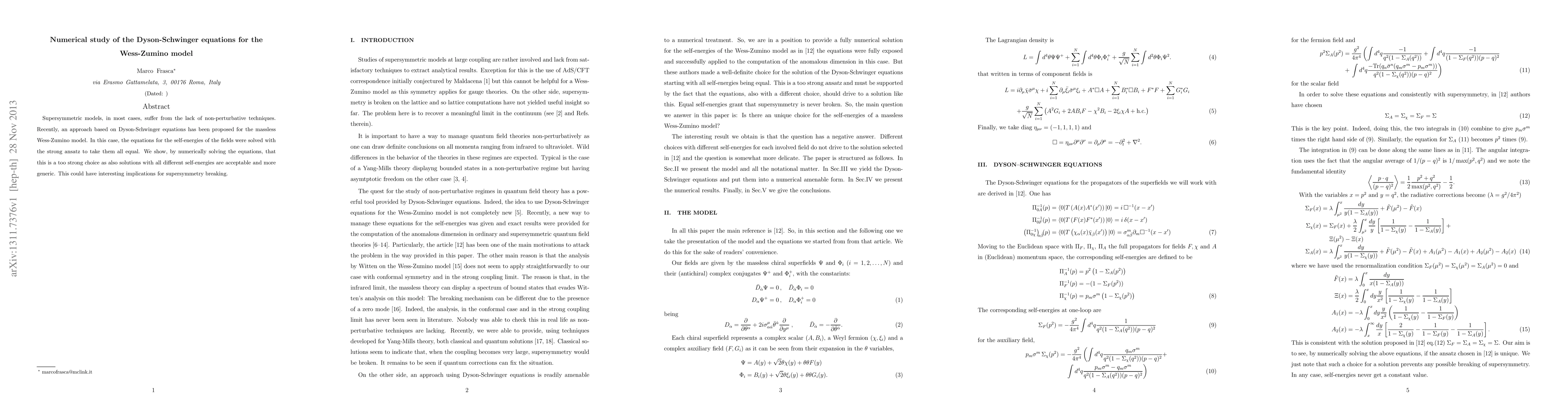 Supersymmetric models, in most cases, suffer from the lack of non-perturbative techniques. Recently, an approach based on Dyson-Schwinger equations has been proposed for the massless Wess-Zumino model. In this case, the equations for the self-energies of the fields were solved with the strong ansatz to take them all equal. We show, by numerically solving the equations, that this is a too strong choice as also solutions with all different self-energies are acceptable and more generic. This could have interesting implications for supersymmetry breaking.