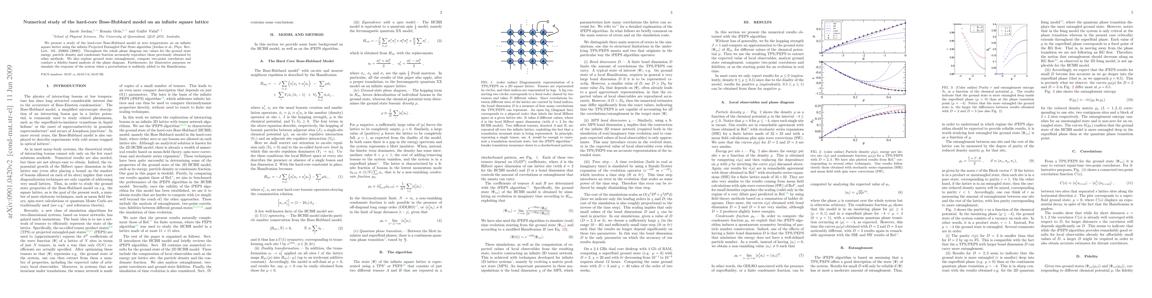 This paper investigates the hard-core Bose-Hubbard model on an infinite square lattice at zero temperature using the infinite Projected Entangled Pair State algorithm, accurately reproducing previous results for ground state energy, particle density, and condensate fraction. It also examines ground state entanglement, computes two-point correlators, and analyzes the phase diagram with fidelity-based methods, along with simulating the system's response to sudden Hamiltonian perturbations.