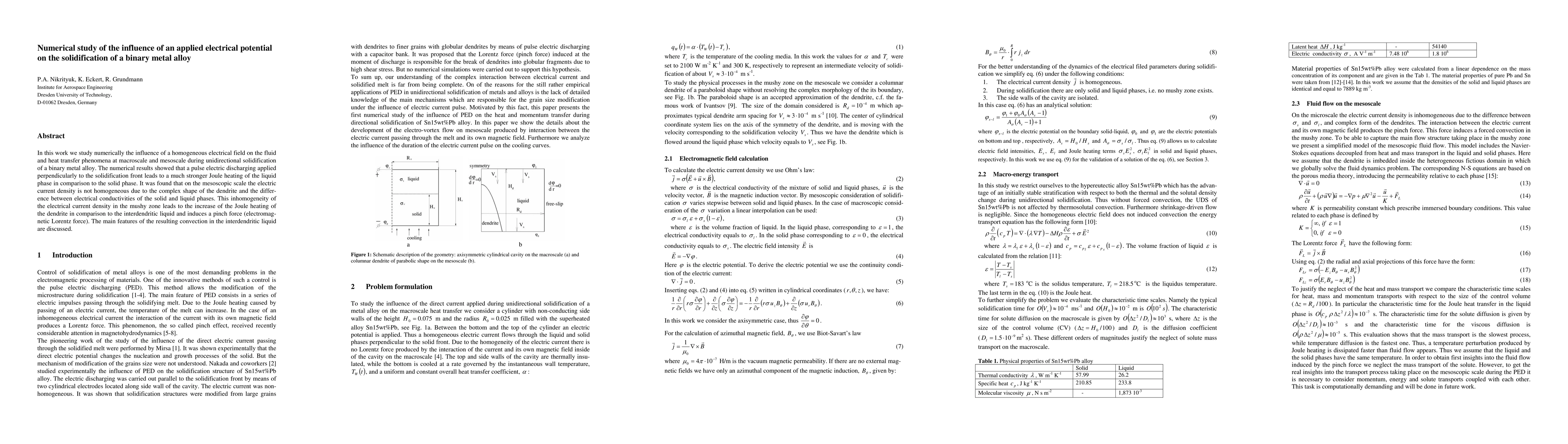 This paper numerically investigates how a homogeneous electrical field affects fluid and heat transfer during the unidirectional solidification of a binary metal alloy. The study finds that pulse electric discharging enhances Joule heating in the liquid phase and leads to non-homogeneous current density in the mushy zone, inducing electromagnetic Lorentz forces and influencing convection in the interdendritic liquid.