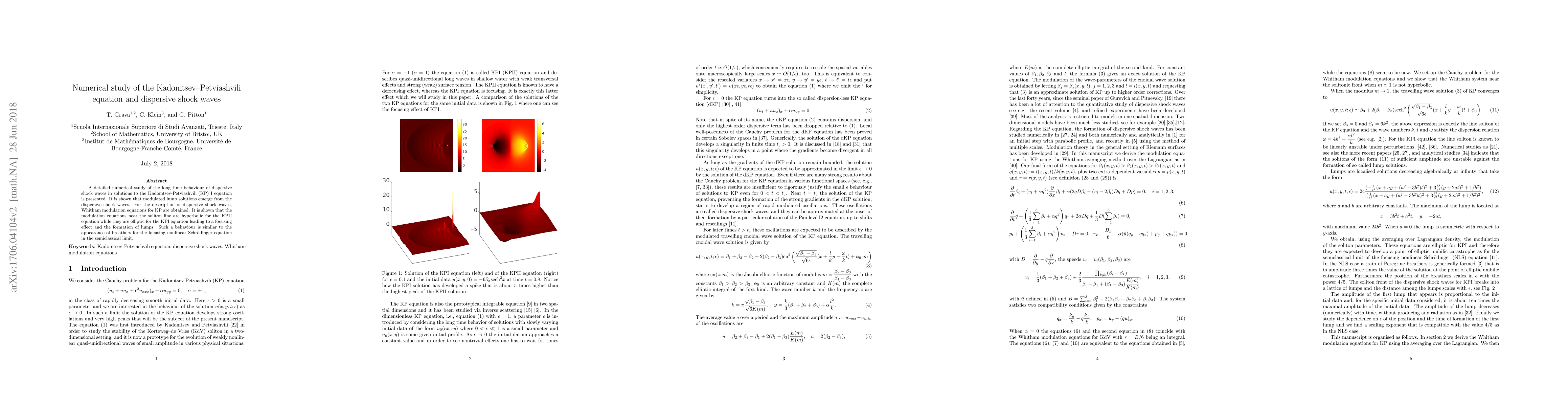 A detailed numerical study of the long time behaviour of dispersive shock waves in solutions to the Kadomtsev-Petviashvili (KP) I equation is presented. It is shown that modulated lump solutions emerge from the dispersive shock waves. For the description of dispersive shock waves, Whitham modulation equations for KP are obtained. It is shown that the modulation equations near the soliton line are hyperbolic for the KPII equation while they are elliptic for the KPI equation leading to a focusing effect and the formation of lumps. Such a behaviour is similar to the appearance of breathers for the focusing nonlinear Schrodinger equation in the semiclassical limit.