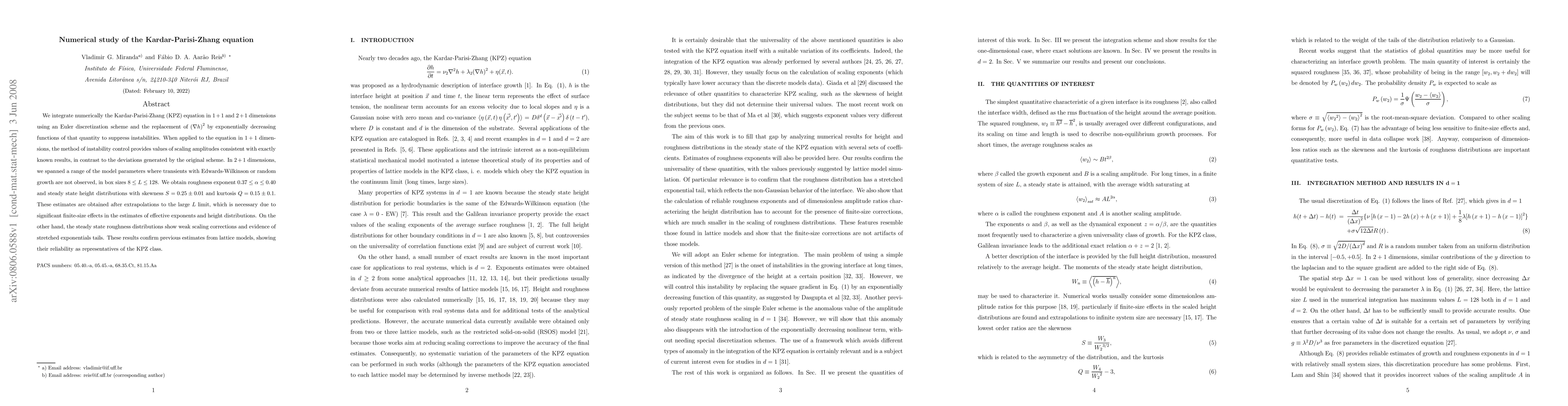 We integrate numerically the Kardar-Parisi-Zhang (KPZ) equation in 1+1 and 2+1 dimensions using an Euler discretization scheme and the replacement of ${(\nabla h)}^2$ by exponentially decreasing functions of that quantity to suppress instabilities. When applied to the equation in 1+1 dimensions, the method of instability control provides values of scaling amplitudes consistent with exactly known results, in contrast to the deviations generated by the original scheme. In 2+1 dimensions, we spanned a range of the model parameters where transients with Edwards-Wilkinson or random growth are not bserved, in box sizes $8\leq L\leq 128$. We obtain roughness exponent $0.37\leq \alpha\leq 0.40$ and steady state height distributions with skewness $S= 0.25\pm 0.01$ and kurtosis $Q= 0.15\pm 0.1$. These estimates are obtained after extrapolations to the large $L$ limit, which is necessary due to significant finite-size effects in the estimates of effective exponents and height distributions. On the other hand, the steady state roughness distributions show weak scaling corrections and evidence of stretched exponentials tails. These results confirm previous estimates from lattice models, showing their reliability as representatives of the KPZ class.